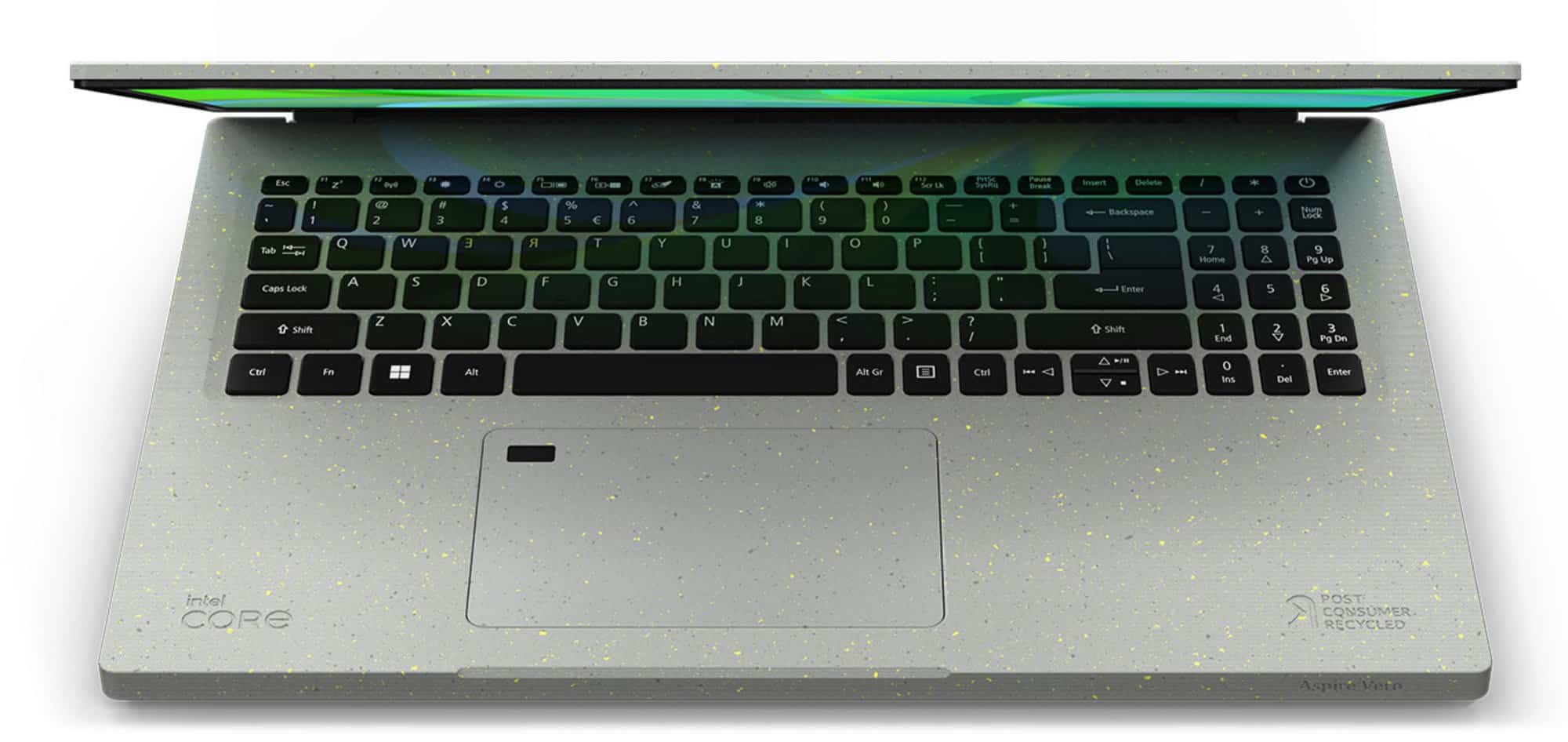 The Acer Aspire Vero is made from post-consumer recycled (PCR) material. It uses a massive 30% overall from its top and bottom cover, screen bezel, and operating surface and 50% on the keycaps.