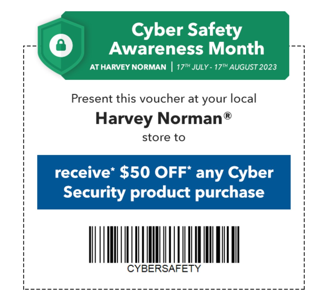 Harvey Norman supports Cyber Safety Awareness Month (17 July to 17 August) by giving a voucher to get $50 off any in-store Cyber Security product.