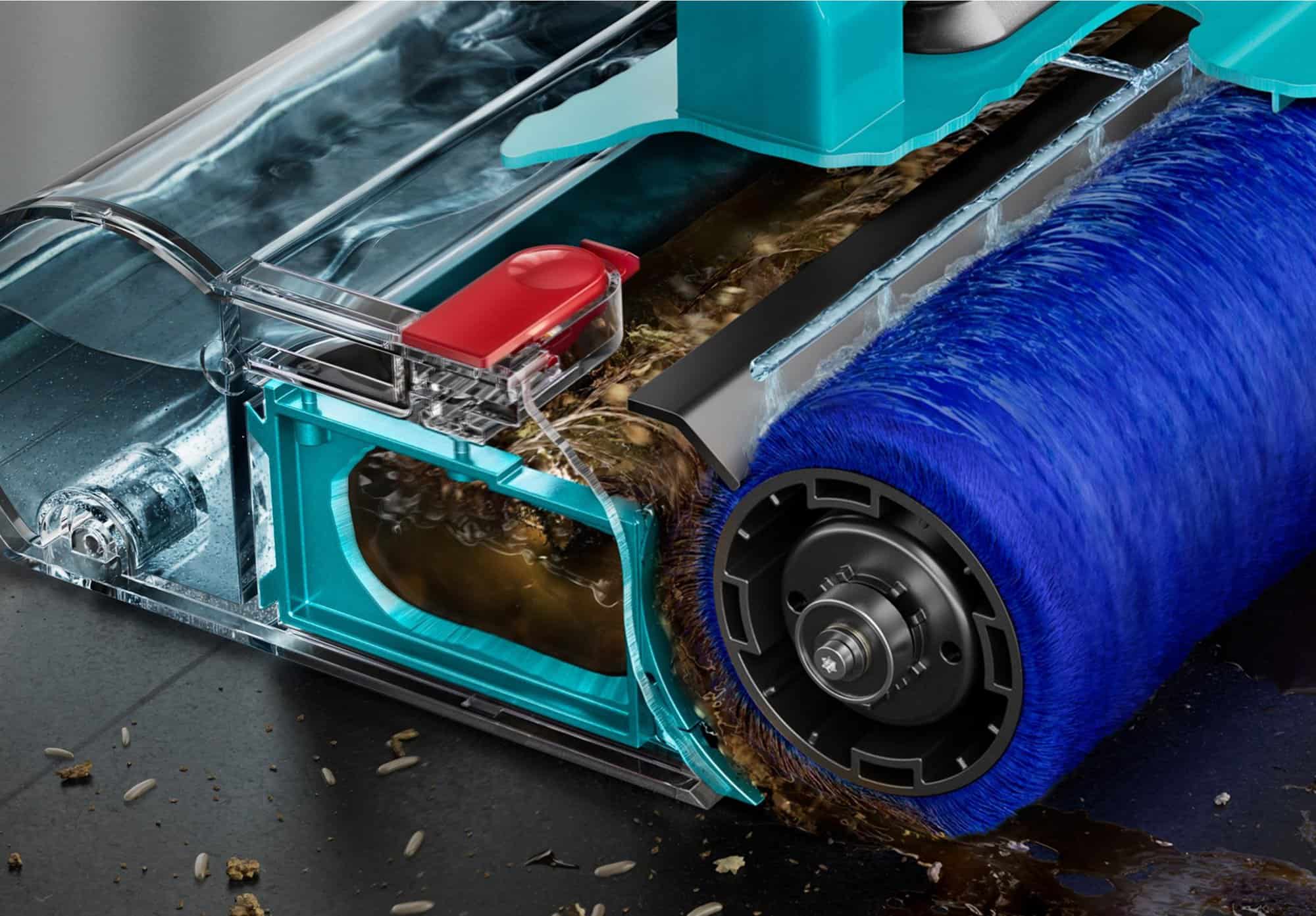 The motor-driven microfibre roller removes spills, tough stains, and debris. A durable plate extracts contaminated water from the wet roller and deposits it into a separate waste-water tray for easy emptying.
