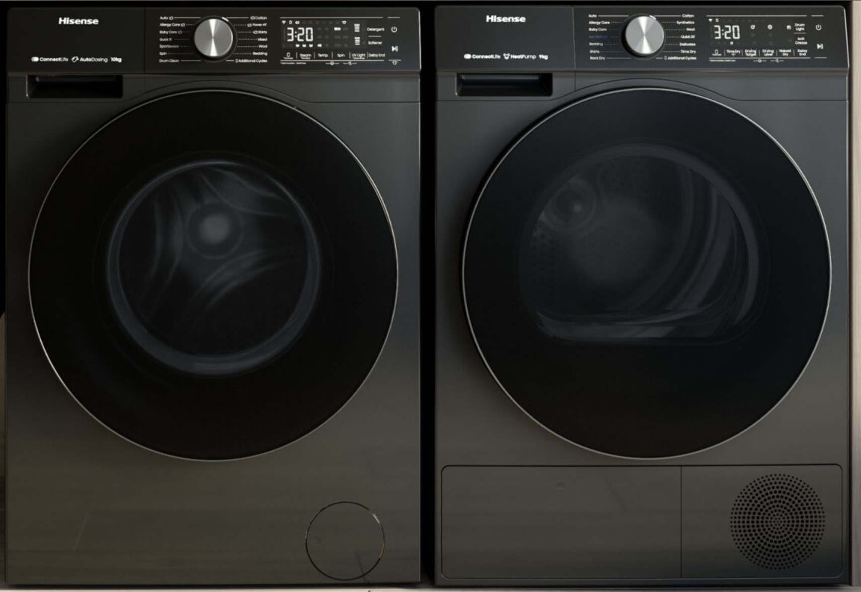 The design matches the $1299 9kg HDFS90HAB 9-star, energy-efficient heat pump dryer. This has Ion refresh, Allergy care, an anti-wrinkle cycle, a quick 30-minute cycle (500g or 2-3 shirts), and ConnectLife App allows Smart Link between the washer and dryer to set drying programs to match the washer load. The doors can be left or right-side opening. It also fits a 600mm cabinet at 595 W x 640 Dx 845mm H x 54kg.