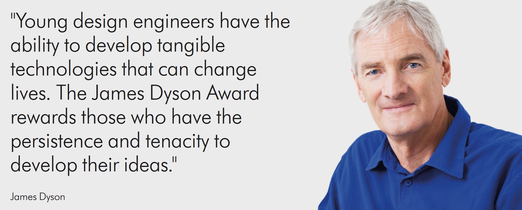 For me the importance of the James Dyson Award is to solve a problem intelligently – for young inventors to question things, challenge things. I truly believe young people want to change the world and in that they should be encouraged. The future is their world. The Award gives them the confidence and a platform to pursue their solutions. In fact, 70% of our past international winners are following up and commercialising their inventions. To future entrants, I look forward to reviewing your radical and game-changing ideas. Good luck!