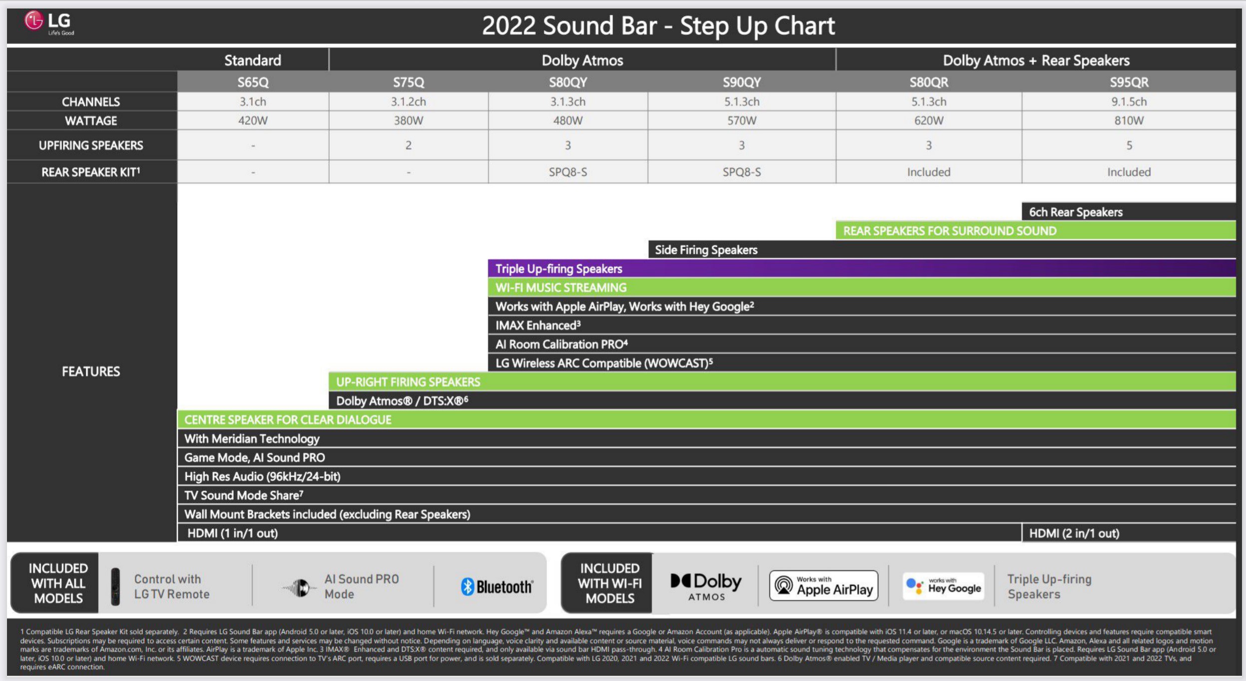The LG 2022 soundbar range goes from a 420W 3.1 system to an 810W 9.1.5 ‘beast’, joining four other Dolby Atmos soundbars in the range.