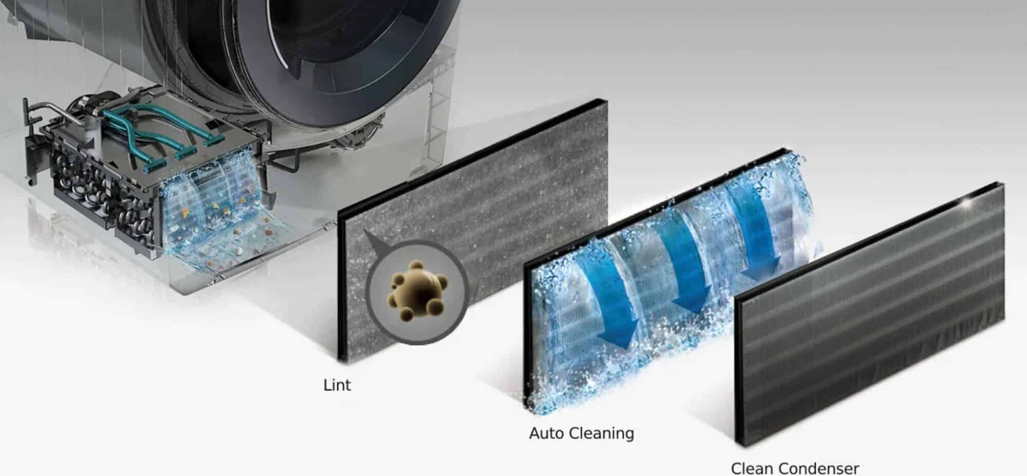- Condenser dryer. A closed system where air flows over a heating coil into the tumble drum, passes through a condenser chamber that dries the air and starts the cycle again. Pro – closed system suitable for internal laundries. Con – Can be quite slow