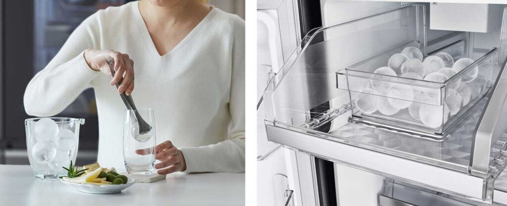 All are in the popular four-door style. Two have Instaview which has become known as ‘tap, tap’ because the right door becomes transparent and allows you to see what is inside without opening the door and letting the cold air out. Baller ice (round golf ball size ice) has quite a lot of tech to produce clear ice balls that melt slower and keep drinks colder for longer. Baller ice takes longer – three balls every 22 hours.