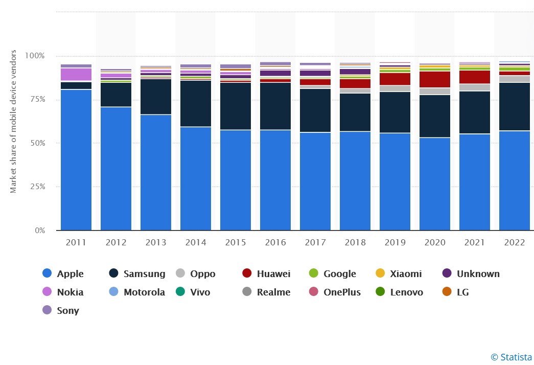 In Australia, things are a bit different. Apple dominates with 55-60% market share, Samsung 25-28%, OPPO BBK 4-5%, Google 2-3%, Motorola and Nokia are both <1%. (Source). Apple’s dominance here is due to a large proportion of lower-cost superseded models and refurbished (Boost/Coles) sales. Samsung’s sales are predominately its lower-cost A series, with reportedly <10% for its Galaxy Series.