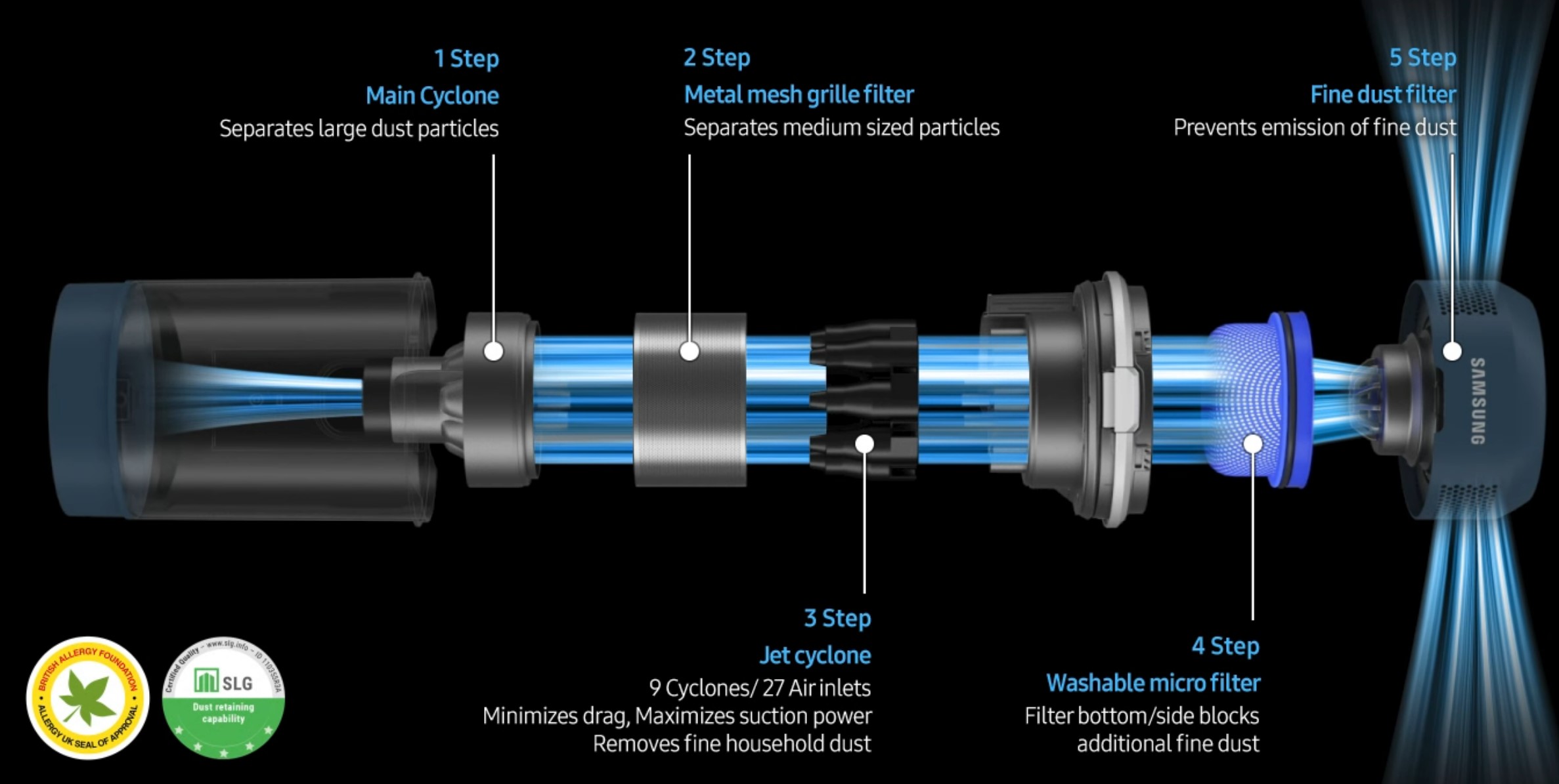 Now, if the thought of vacuuming leaves you cold, the Samsung Bespoke Jet has 210W of suction power (Max mode, of course) and up to 120 minutes runtime (minimum power mode, of course). Its five-layer filter system traps 99.99% of dust larger than .5um.