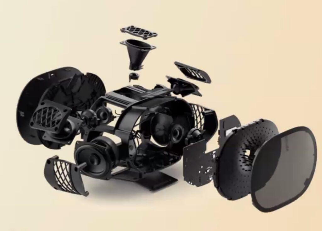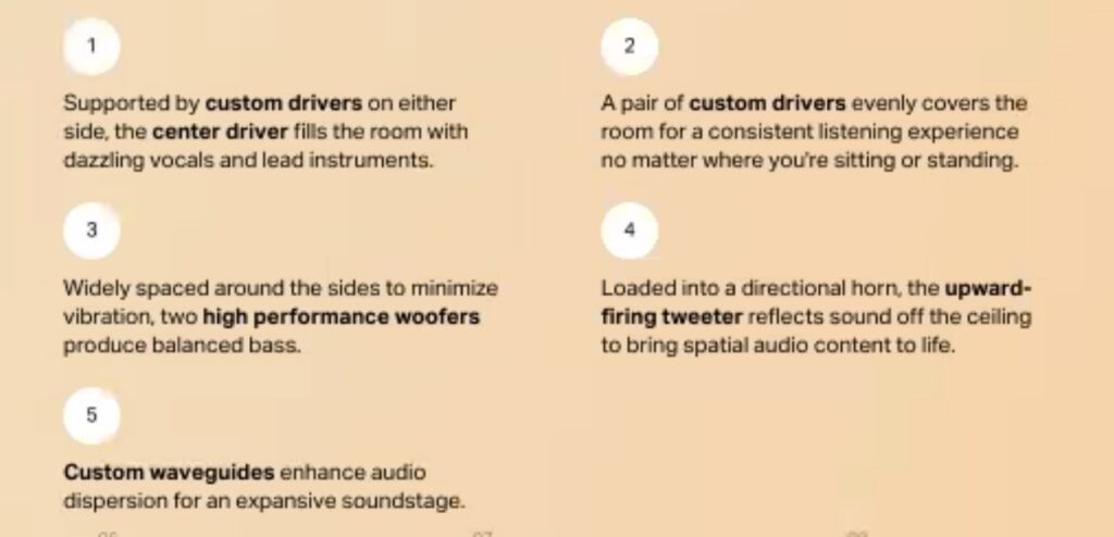 It has six drivers to fire out sound in all directions – left/right stereo, left/right surround, centre forward firing and up-firing to deliver full Dolby Atmos sound. Technically, a single Era 300 is a 5.0.1 virtual Dolby speaker; when used with stereo content, it is a full 3.0. Or you can use a pair as Dolby Atmos front speakers and pair it with a mini-sub.