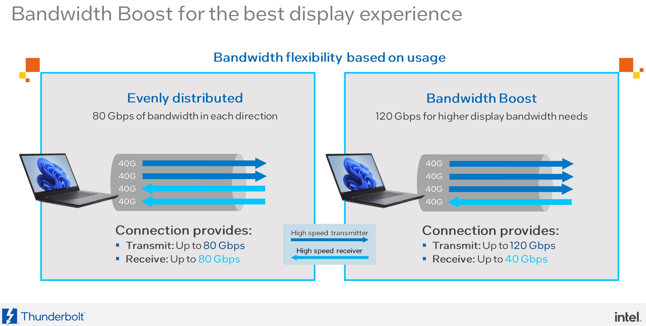 It has four 40Gbps lanes – usually two up and two down. Additionally, it offers a Bandwidth Boost for up to 120Gbps video (three up and one down), allowing 8K monitors, dual 6K monitors and three 4K@144Hz monitors. This will require DP 2.1 and PAM-3 (Pulse Amplitude Modulation) compatible devices that can accept 120Gbps rates. It also enables passive cable lengths up to 1m.