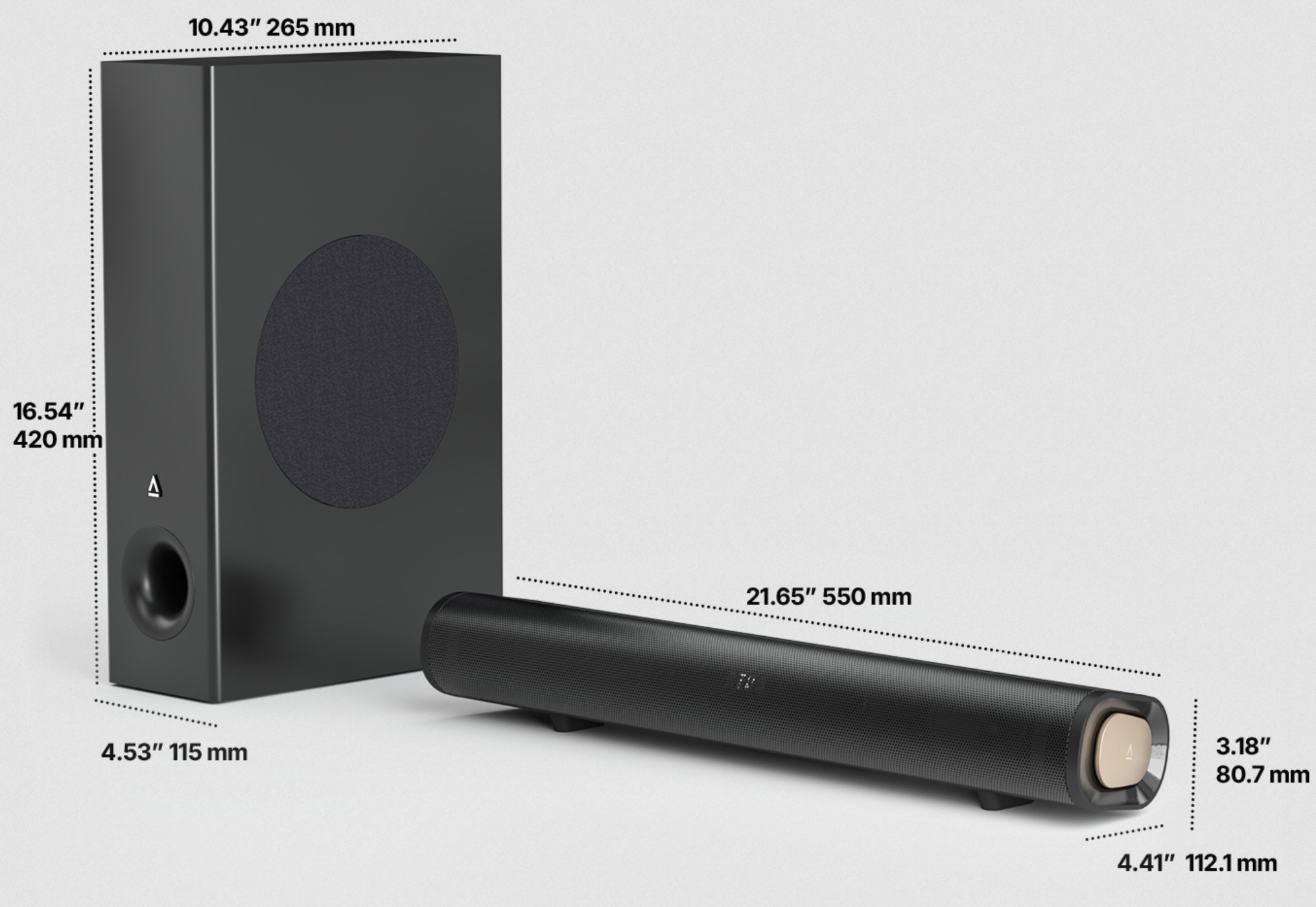 The soundbar is 550 (L) x 112 (W) x 80.7 (H). The subwoofer is 420 (H) x 265 (L) x 115mm (W) and 3.4kg. It fits anywhere, and that is why Creative included desktop and TV placement, because this will be a hit with gamers as well as TV users.