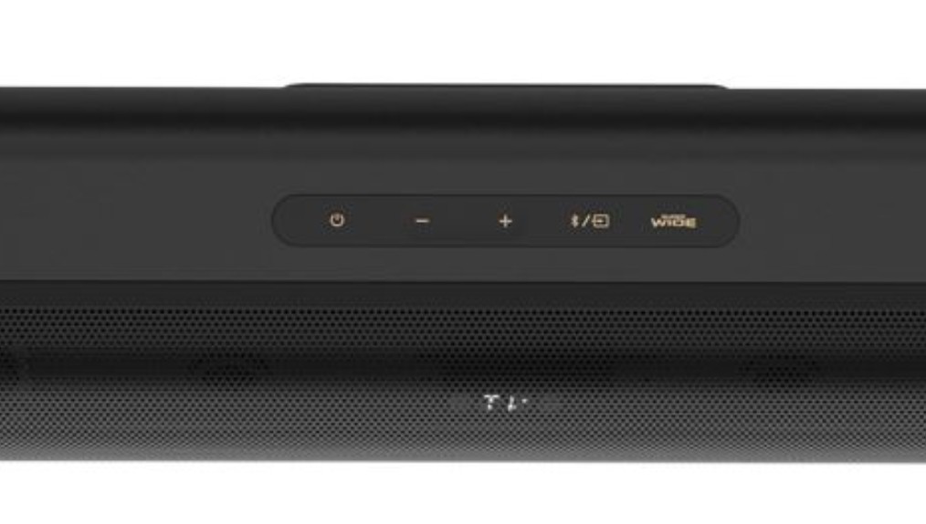 A LED display at the front shows volume levels, source input, and sound mode. The top buttons are for power, volume, input selection, Bluetooth, and toggling SuperWide mode. You could also use the remote control (2 x AA batteries not included).