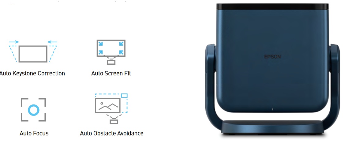 Epson’s EpiqSense technology simplifies setup. Using a dToF IR camera and return sensor, it automatically resizes, focuses, and aligns the picture to fit almost any surface. Tilt is -30 to +120°.