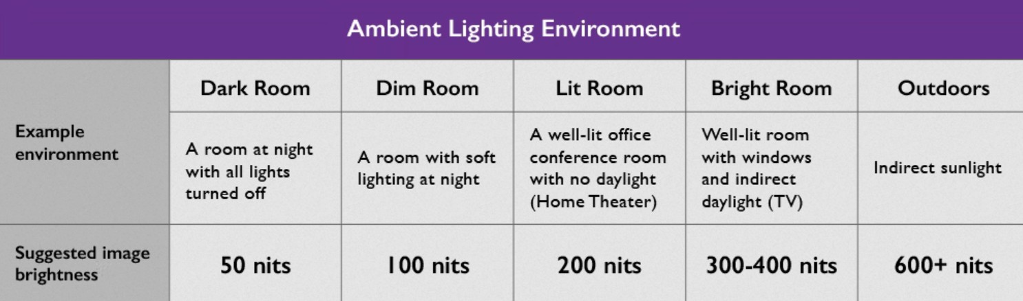 But with a projector, the screen is not the light source, and brightness depends on the projector’s distance to the screen, screen size, its screen’s positive or negative gain (whether it reflects all the light – most painted walls don’t), ambient room light, and the perceived brightness at the viewing distance!