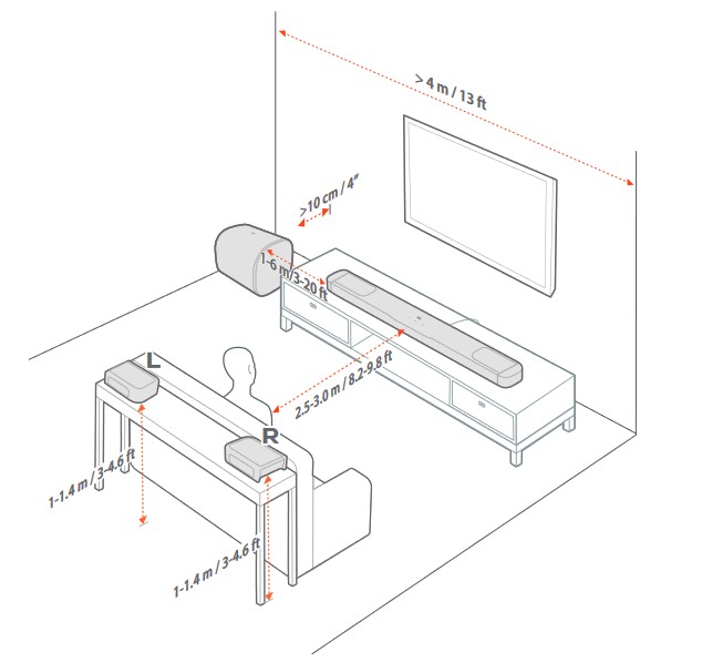 The soundbar can be placed on a desktop 500-700mm off the ground or wall-mounted about 120mm below the screen (assuming the middle of the screen is at seated eye height). Wall brackets are supplied. Remember, wall mounting will have obvious power and HDMI cables unless you can conceal them or perhaps use the One Commander.