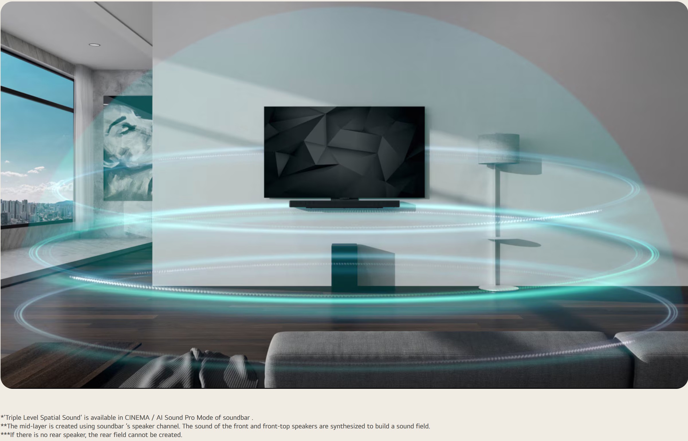 A DA conical-shaped envelope, regardless of how good the soundbar is, extends about 3 metres from the TV screen.