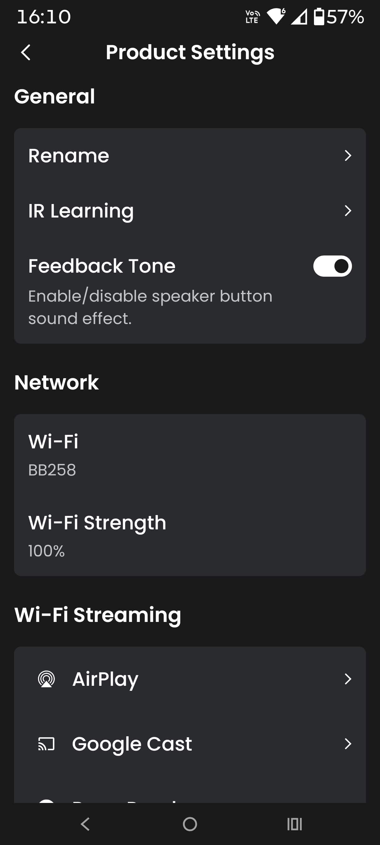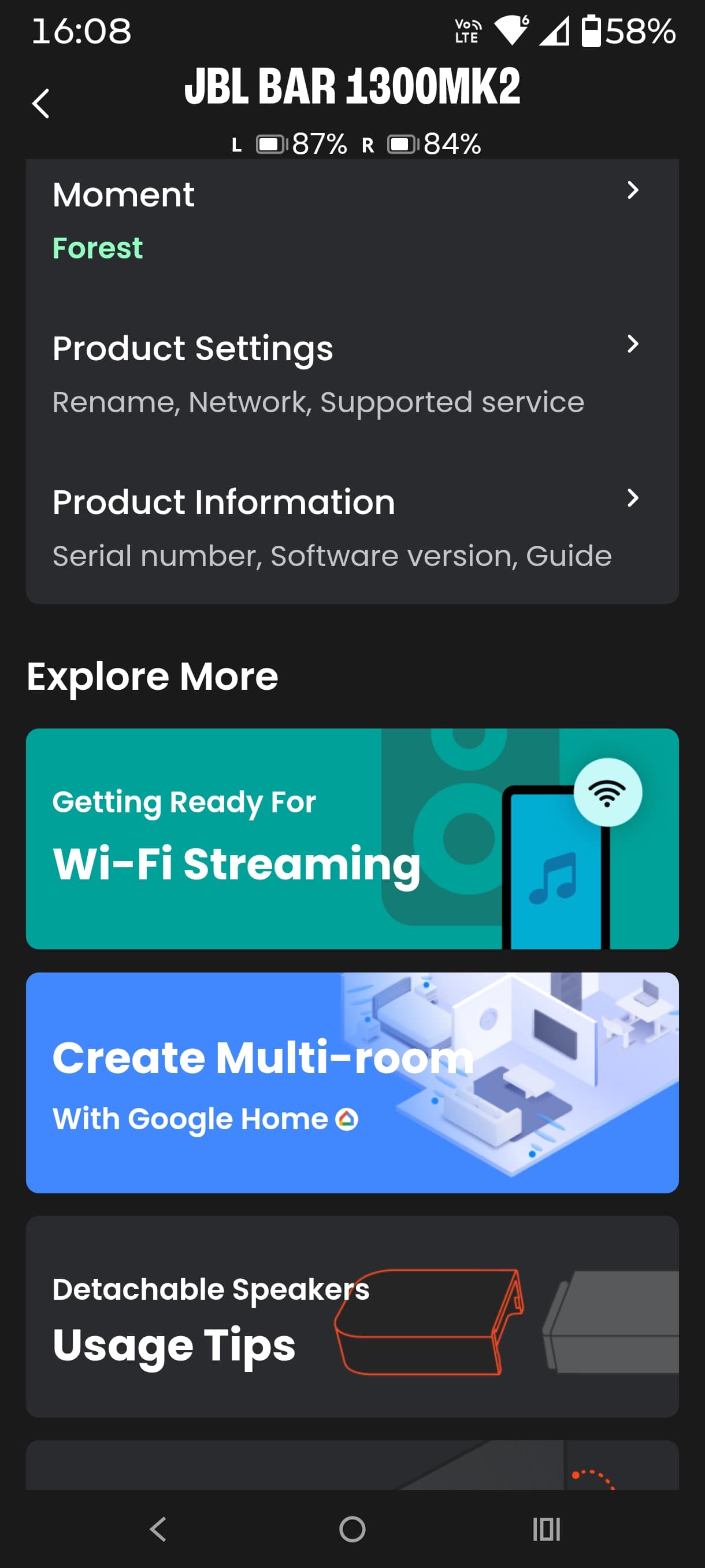 The rear speakers are BT 5.4 and support multi-point and Auracast. Codecs are 16-bit/48000kHz SBC and AAC. High res is supported via Wi-Fi streaming.