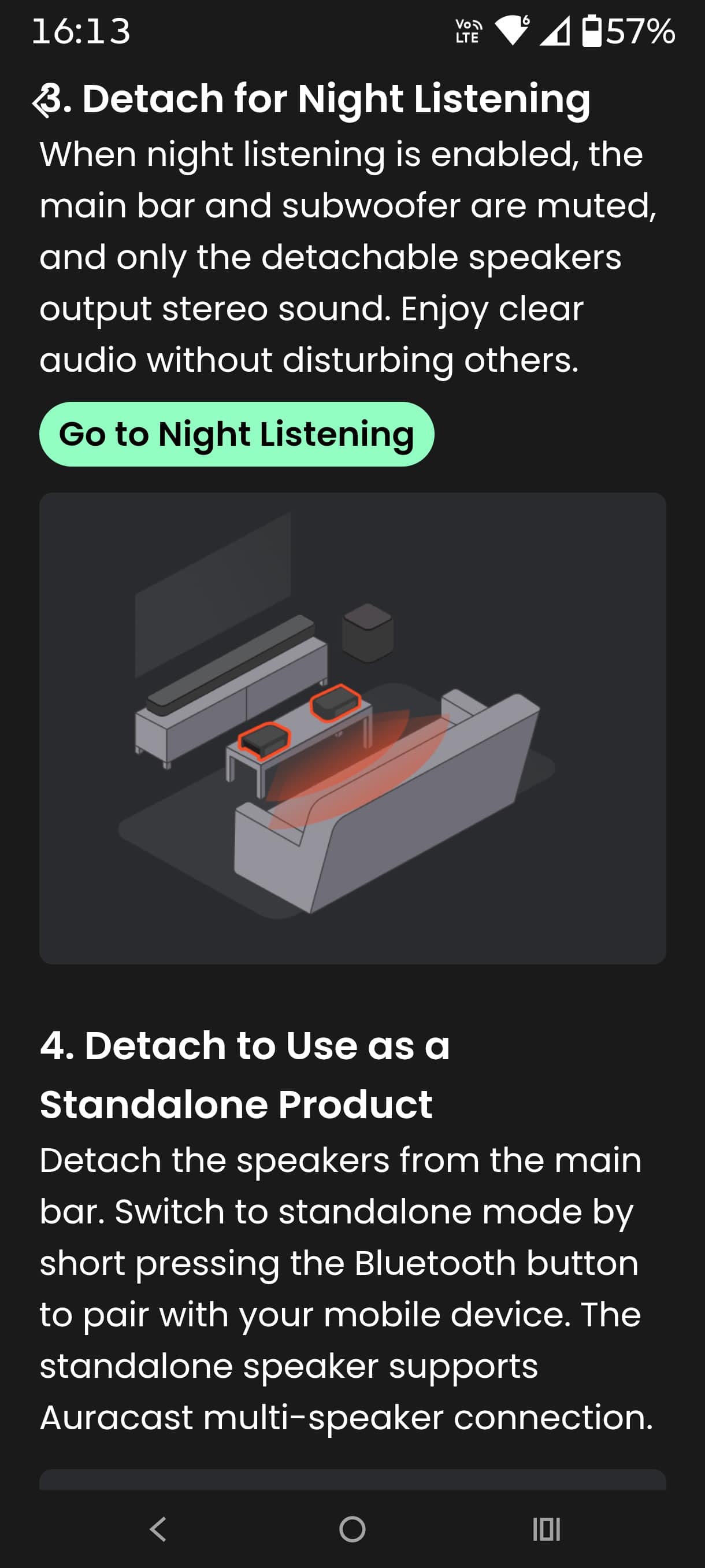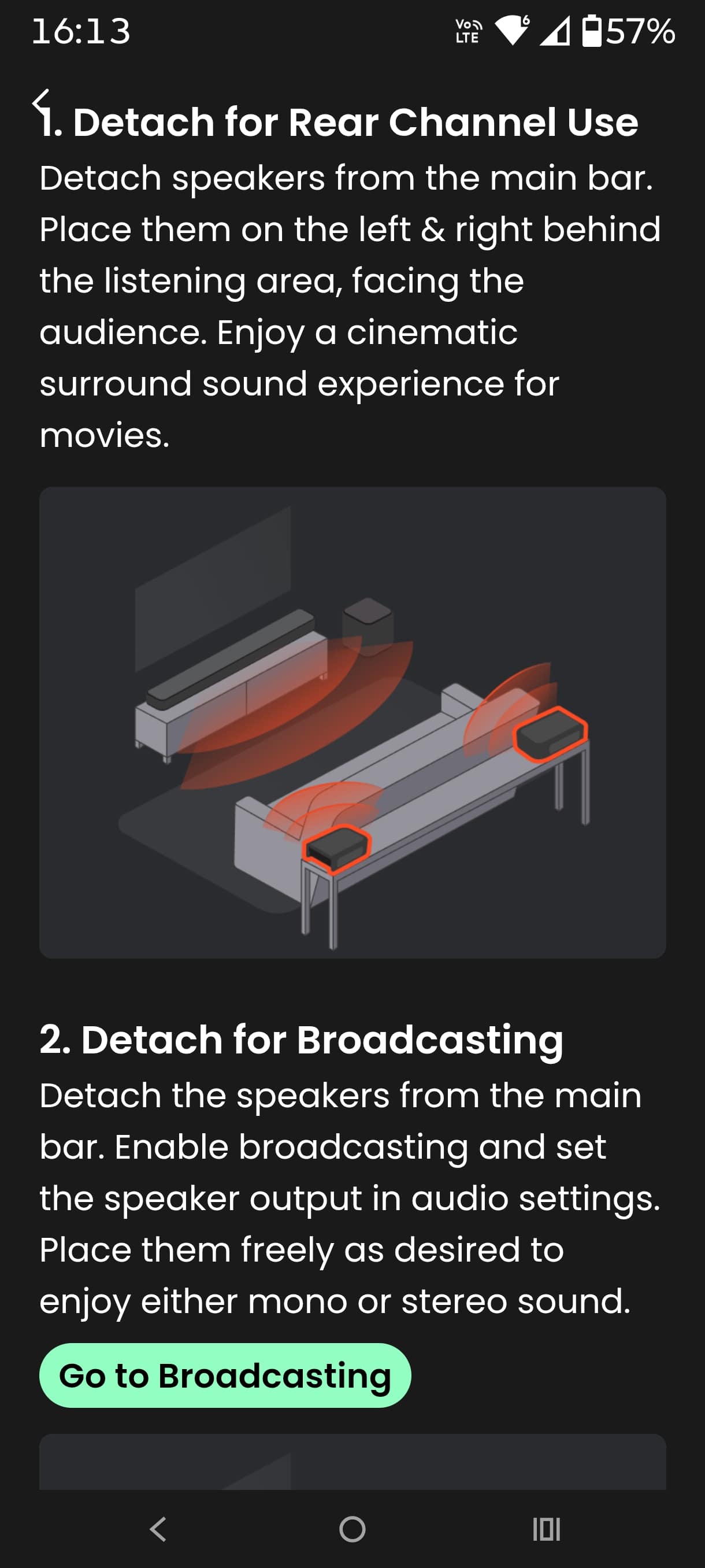 - The rear speakers are Bluetooth 5.4 (mono or stereo) pairable and become 160W, 10-hour portables (4-hour charge). They are also BT Auracast compatible, like many other JBL speakers and earphones. They can also be used as a ‘soundbar extender’ (called Broadcast) in another room. They can also be used for night-listening with the soundbar and sub muted.