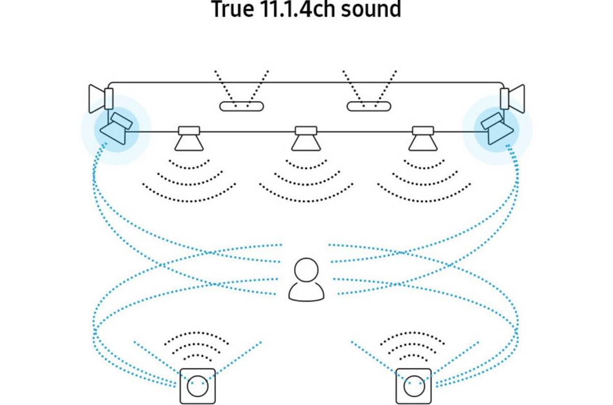 This is an 11.1.4 DA/DTS:X soundbar. That means 11 discrete 2D (horizontal) channels, one sub and four 3D (height /spatial) channels.