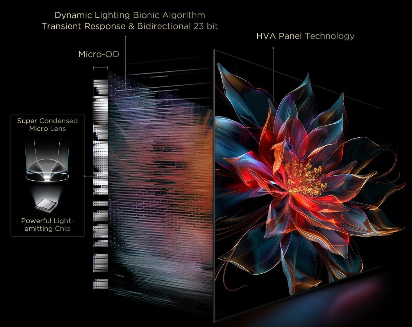 The next innovation is TCL’s super condenser micro Lens over the mini LED light source. It allows the backlight to sit far closer to the panel (called micro-OD), meaning more light gets through. TCL has developed a Dynamic Lighting Bionic Algorithm that works in conjunction with Transient Response and Bidirectional 23-bit technology for improved halo management and uniformity.