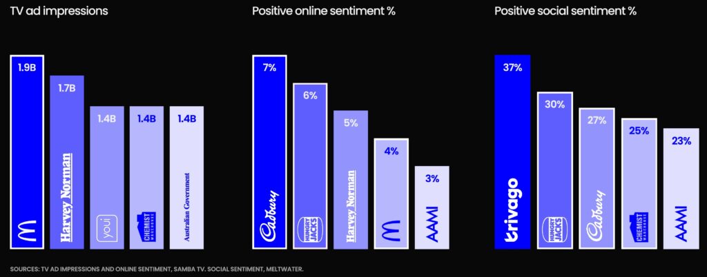 McDonald’s stood out in balancing all three, with its nostalgia-driven “Squad Down Under” campaign that united iconic Birdie, Hamburglar, Officer Big Mac, and Grimace characters, ranking as the #1 advertiser based on TV and impressions and #4 based on online sentiment.