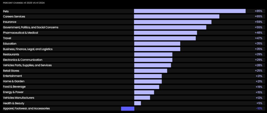 Advertisers within non-discretionary categories like Insurance (+59%) and Pharmaceutical & Medical (+48%) saw some of the biggest increases in ad impressions.