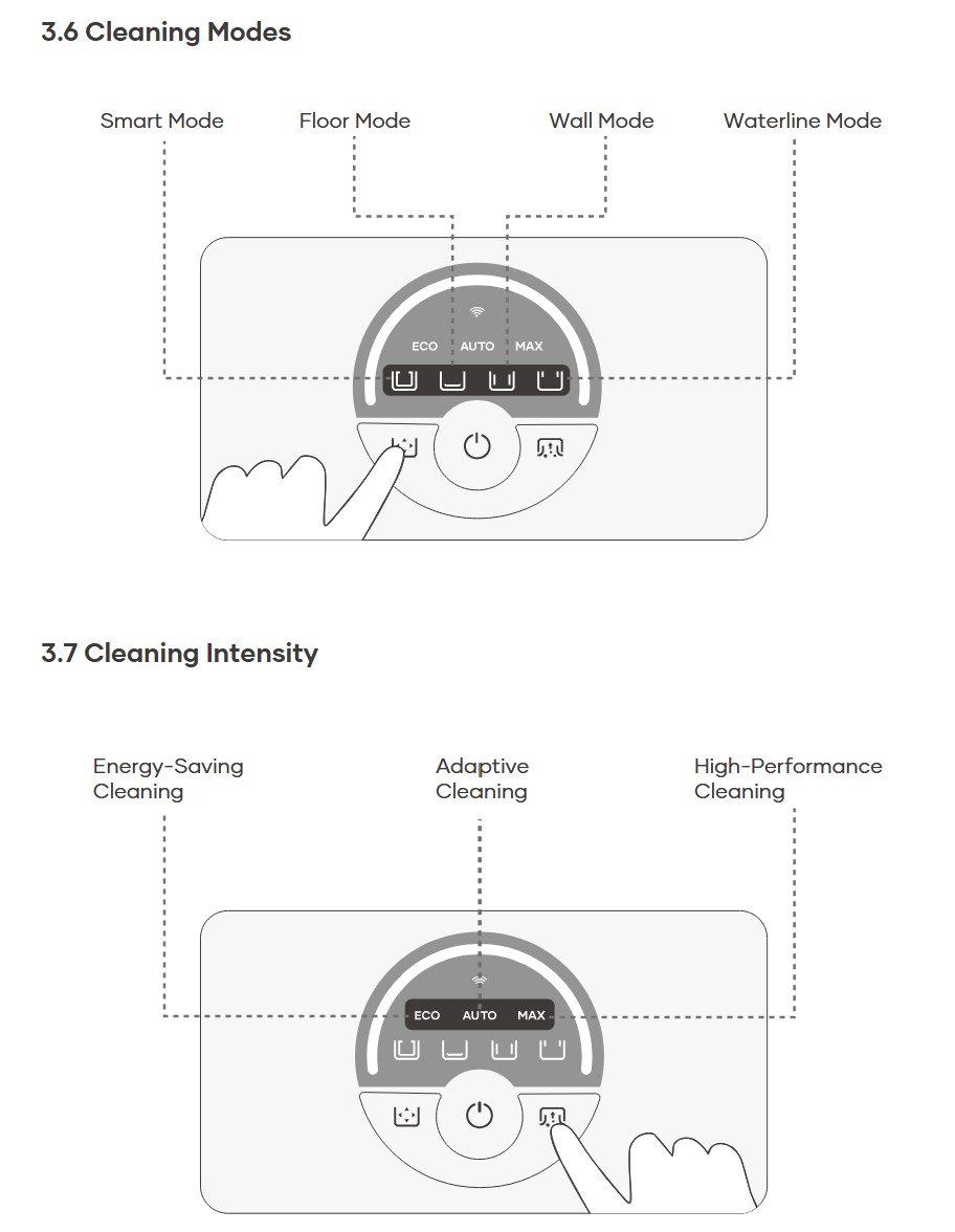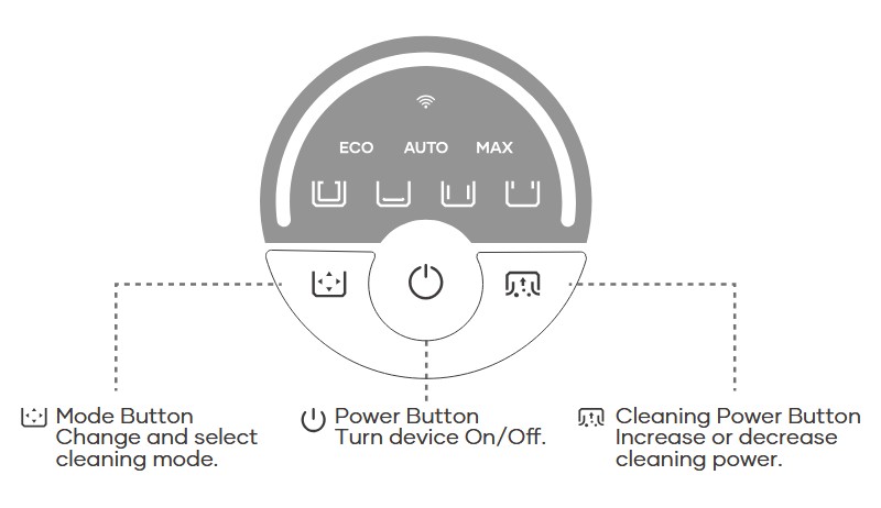 The power button has added buttons for Eco (energy saving), Auto (adaptive) and Max (higher performance). Otherwise, it has the same cleaning modes: Smart, Floor, Wall and Waterline.