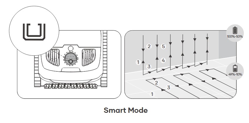 Initially, it cleans along the pool’s floor contour to create a map. There is no need to redo the mapping for the same pool. At each subsequent use, it briefly moves 360° to relocate (compensates for placing it in a different location).