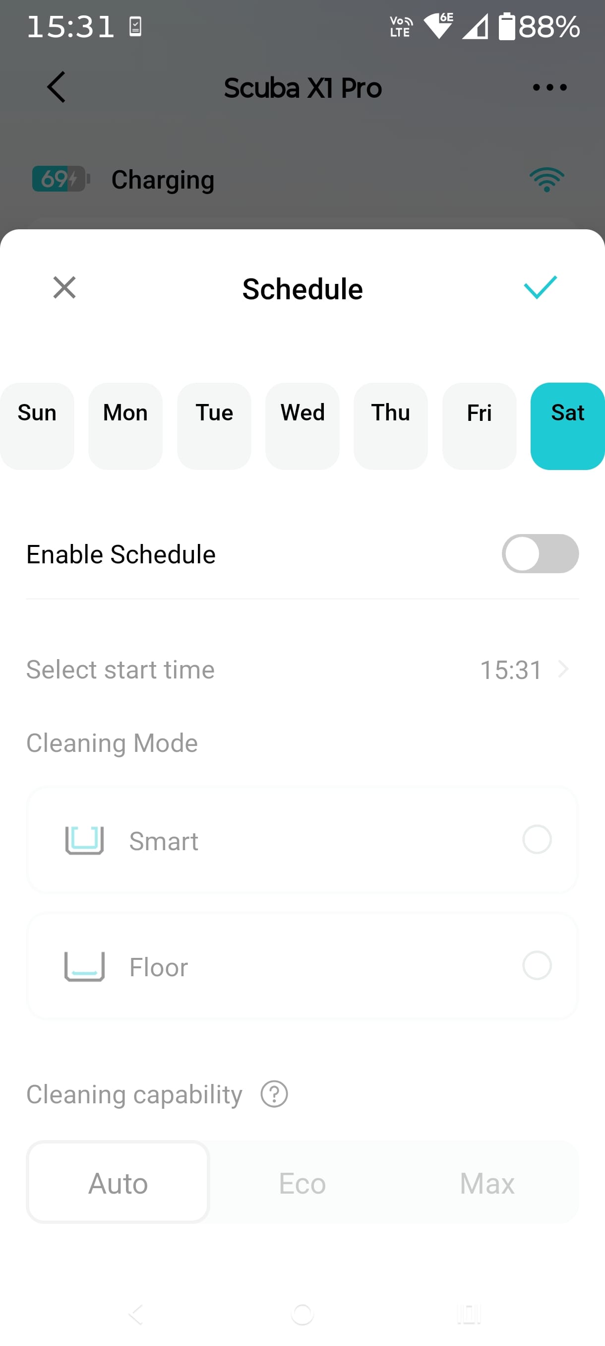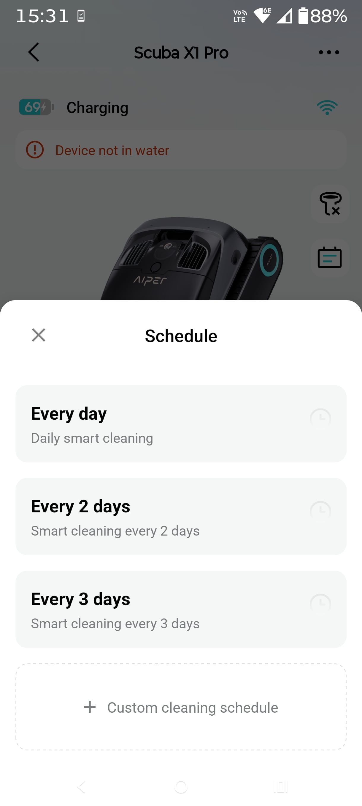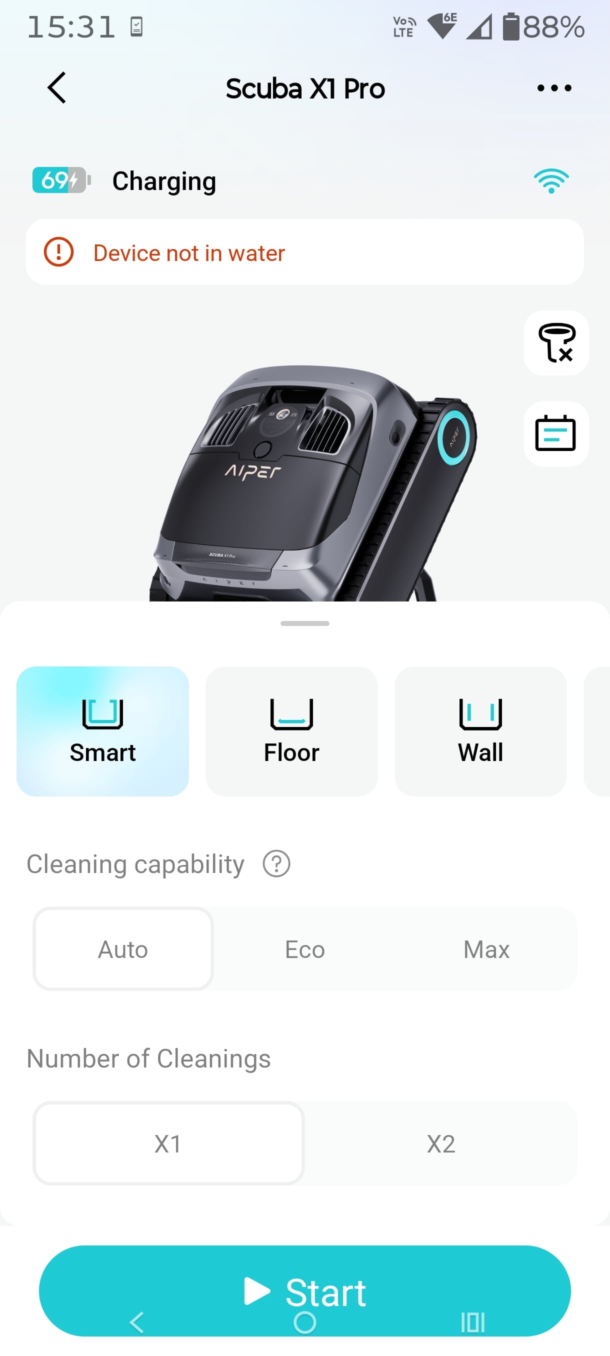 As you get to know the Aiper Scuba X1 Pro, you can adjust the cleaning time to suit the floor, walls, etc. Then you can use the schedule mode, leaving the device in the pool. We managed to get two smart cleans or three floor cleans.