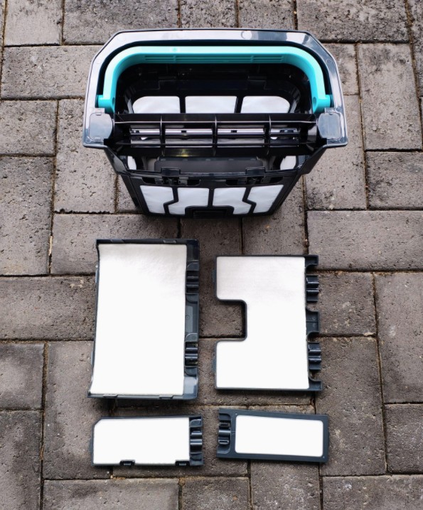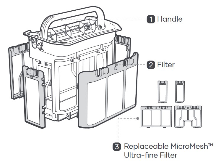 The filter box has a 5-litre capacity. It can filter down to 180 micrometres (hair is 70 micrometres). It includes a set of 3um filter pads that remove algae and pet hair. Both are washable, and the 3um filter pads can be replaced when they are no longer effective. The filter box has clips for the filter pads. They are fit for purpose, but could break easily if too much pressure is applied.