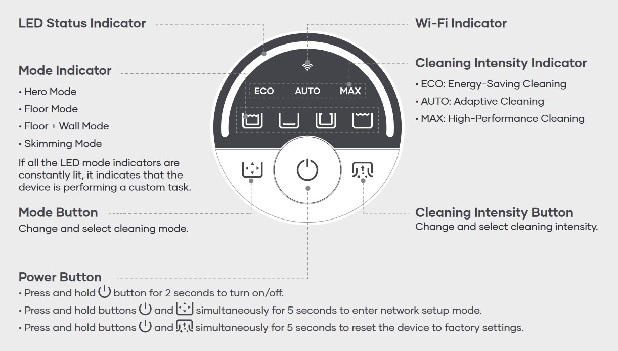 - ECO: Still does a complete clean but at lower power use. Extends battery time.