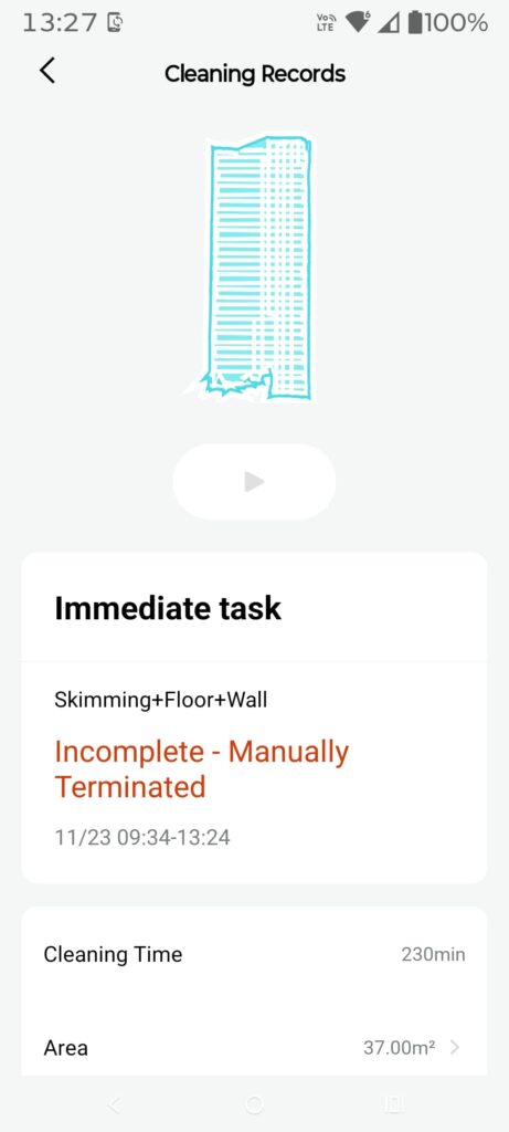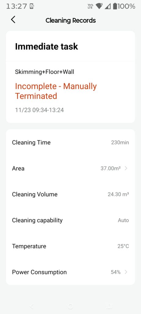 Our test pool used (37m2 surface, 230 minutes total, 54% battery used)