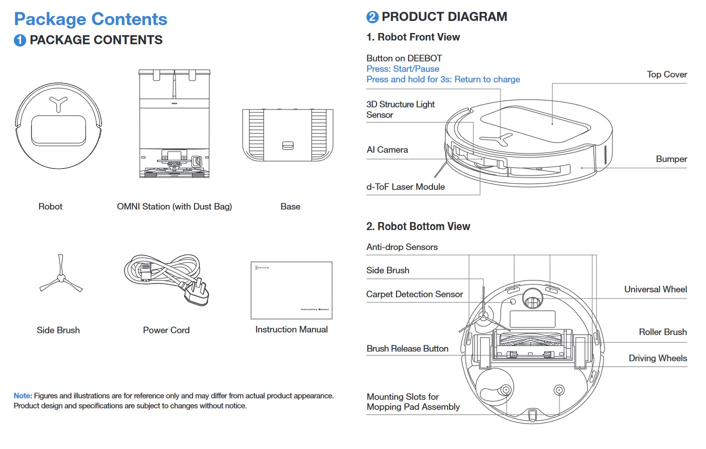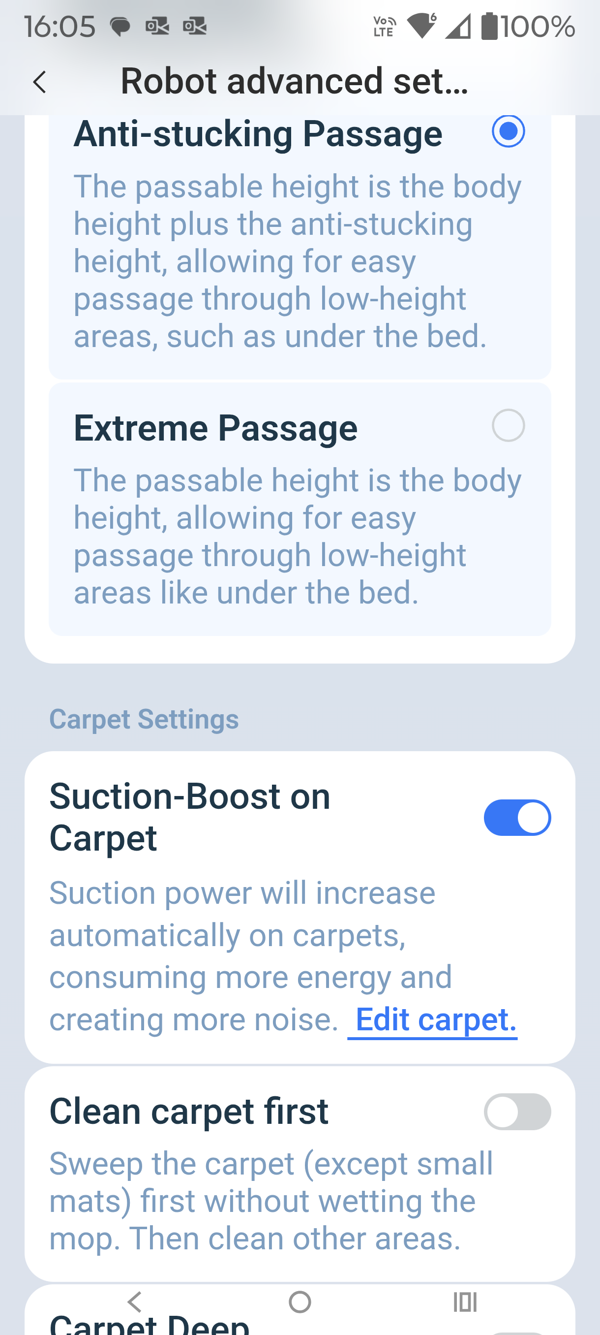 Carpet: As the mop pads are lifted (up to 9mm) and retracted, there is a 110mm gap between the rotating roller and the edge on each side. This is common to all round robots.
