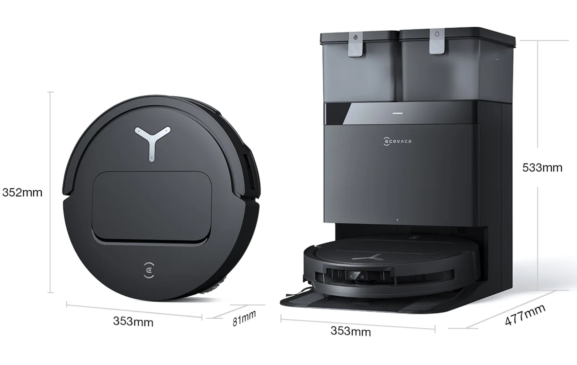 The OMNI cleaning station is 350 x 477 x 533 x 7.6kg, with the obligatory free area (.8m) in front and to each side (.5m). It has fast charging, an ECOVACS cleaning solution reservoir, 75° hot water mop cleaning, and 45° hot air drying. With 4L clean and wastewater tanks and a 3L dustbag capacity, it is suitable for 300m2 cleaning.