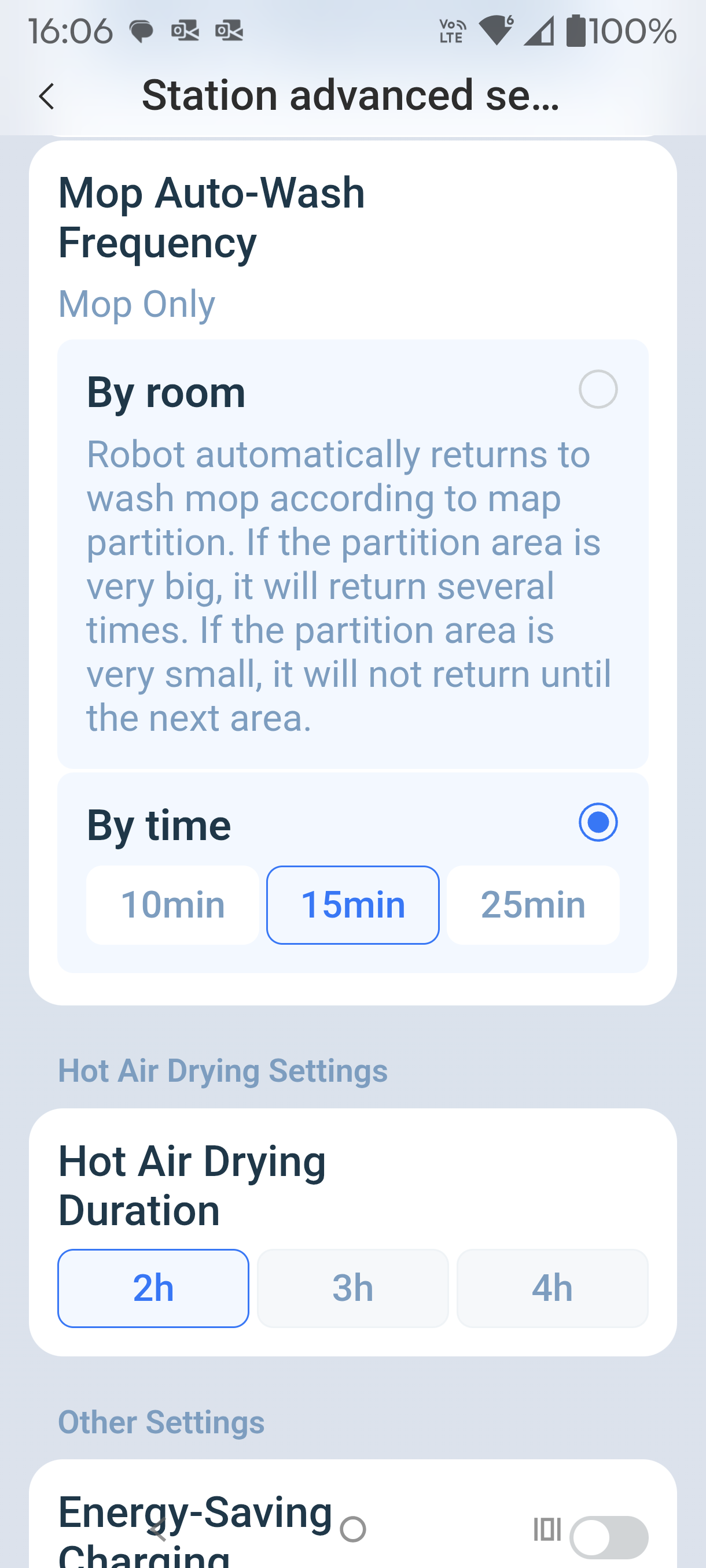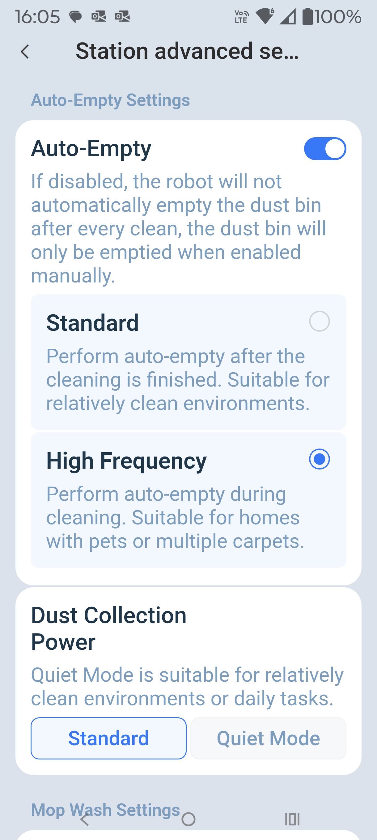 The OMNI station draws 1650W with hot water mop washing and a little less on drying. Auto-empty is 650W.