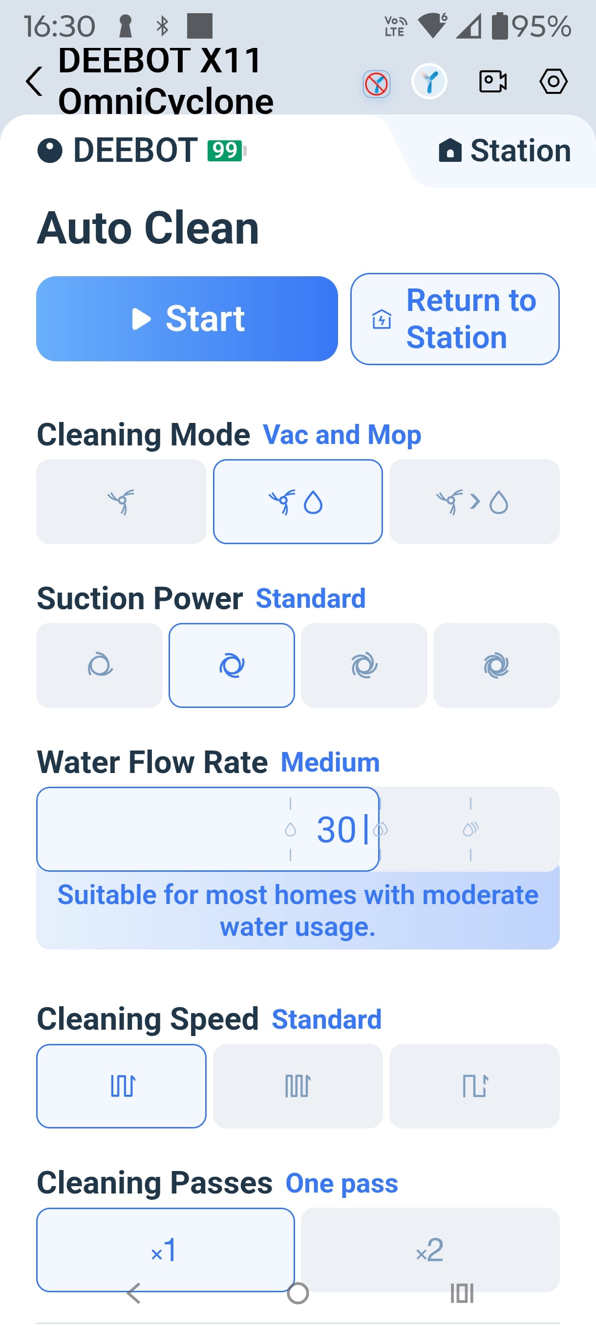 - Standard: 75 minutes, used 50% battery and about 33% of the clean water. 3 returns to the dock