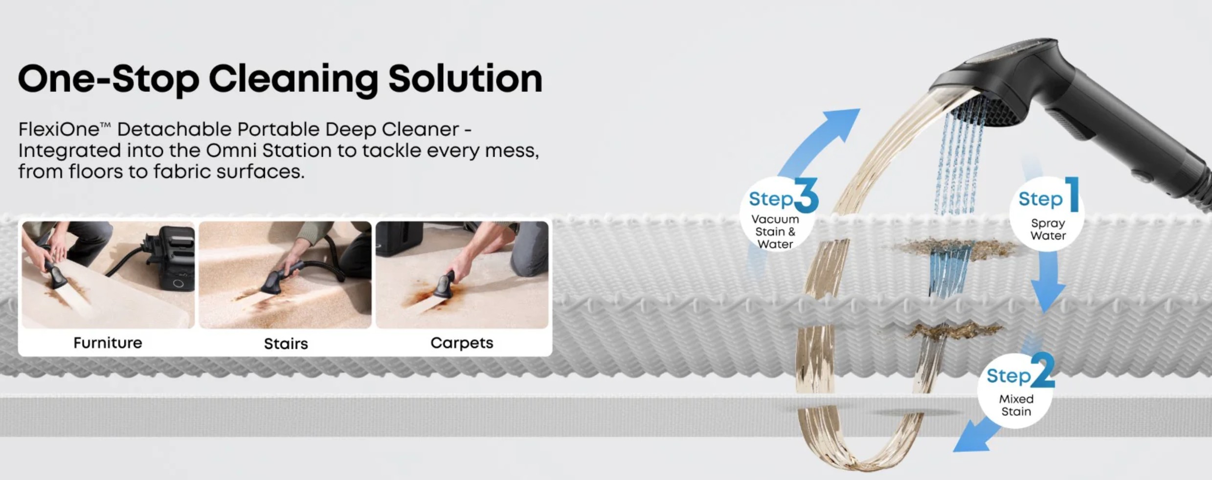 It is an ingenious design that combines a lift-off combo clean and wastewater tank with a powered spray brush and flexible extension tube to remove stains.