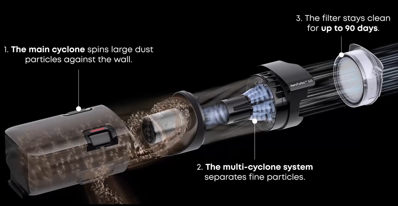- The Robot’s internal AeroTurbo 2.0 cyclone dustbin means power remains constant instead of dropping off as it fills. It also allows maximum suction to get to the floor.