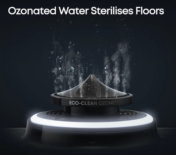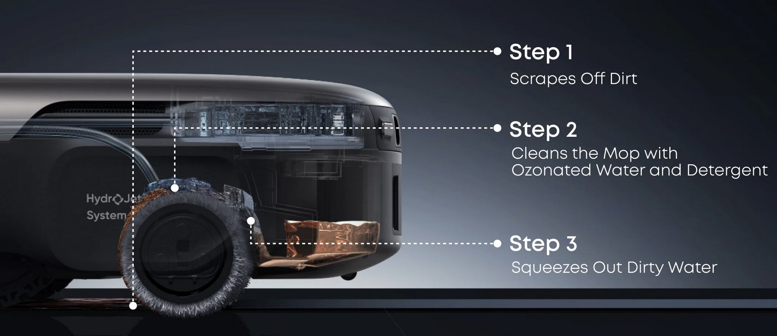 It has a HydroJet 30cm, 180RPM Roller mop with 1.5 kg downwards pressure. Dual scraper/squeegees remove the waste. It was noted that it uses less water than most robots.