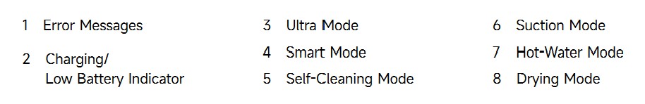 • Auto (what most will use): adjusts the suction according to how dirty the floor is. A visual indicator shows light, medium or heavy dirt appears on the LCD. There is no heated water in this setting