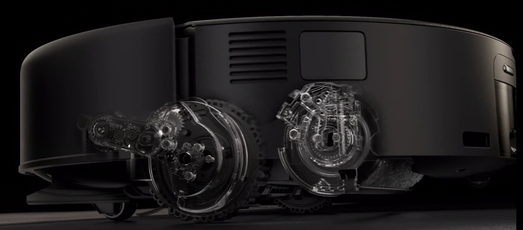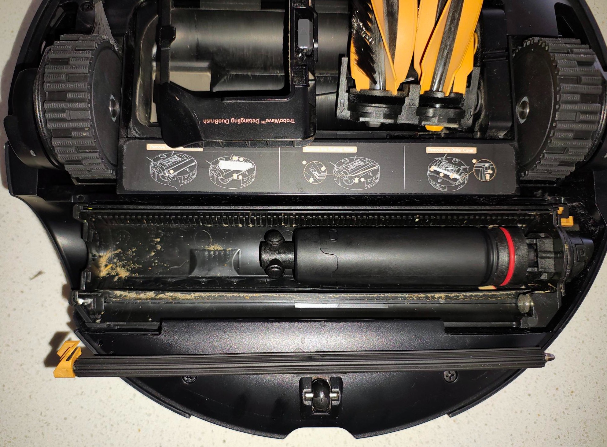 The right-side whisker operates (on hard floors only) and can extend. On the left underside is a rubber lip that helps direct detritus into the brushes.