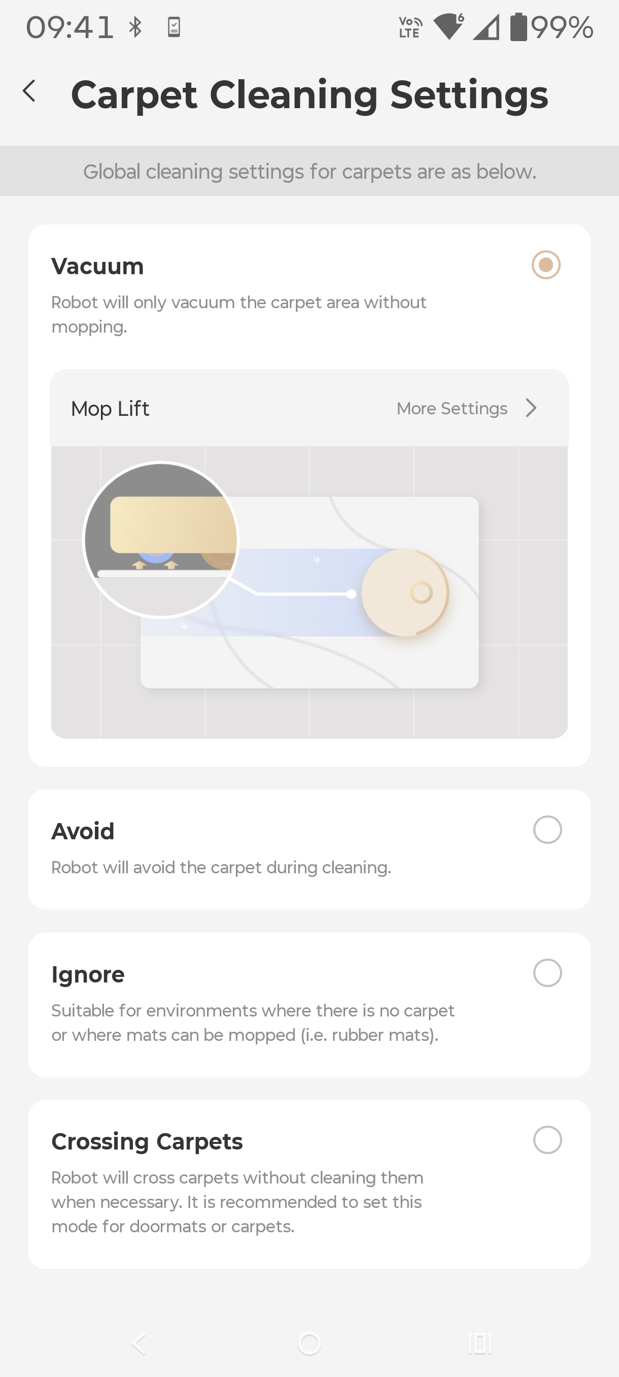 Carpet: The whisker is disabled, and there is no corner clean due to the round robot shape.