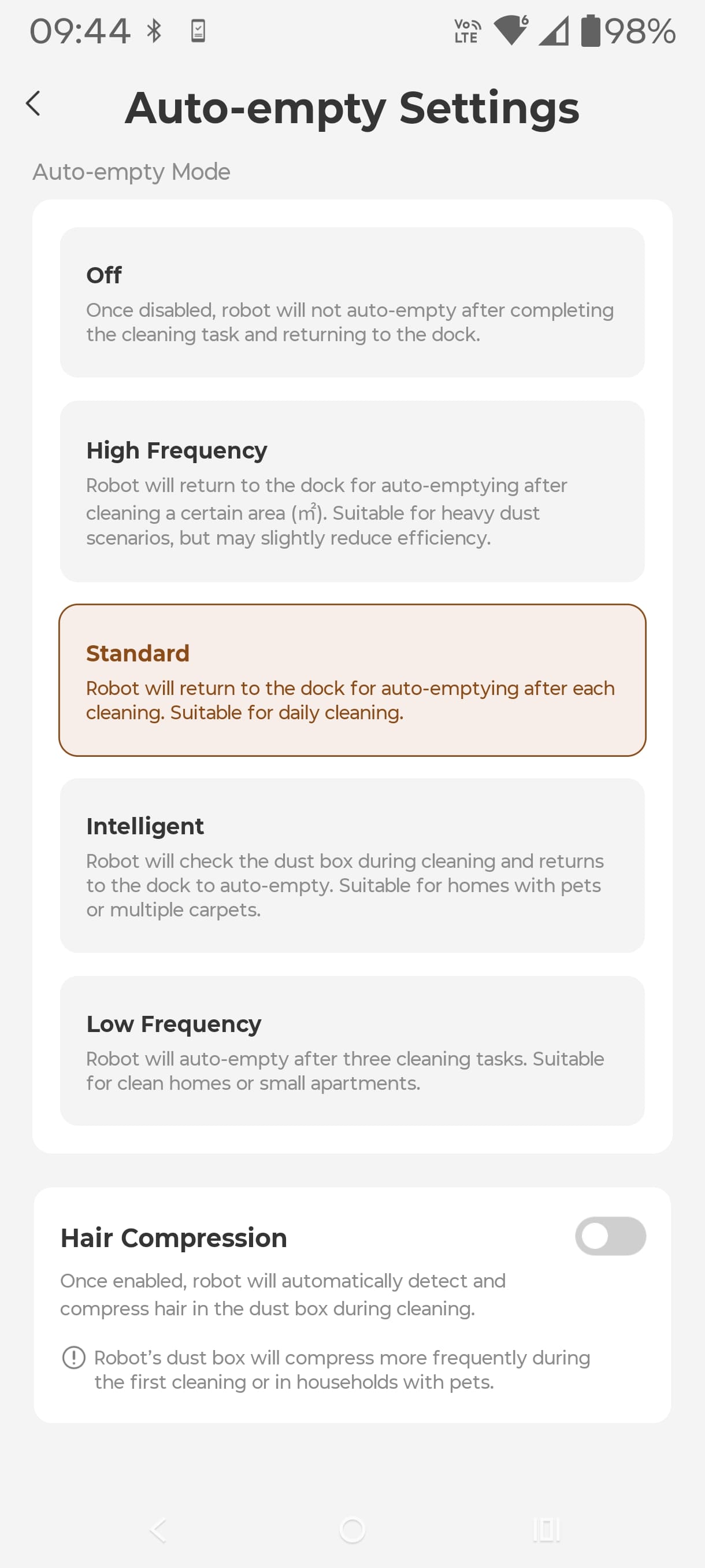 It has a dust/hair compression in the internal dustbin.