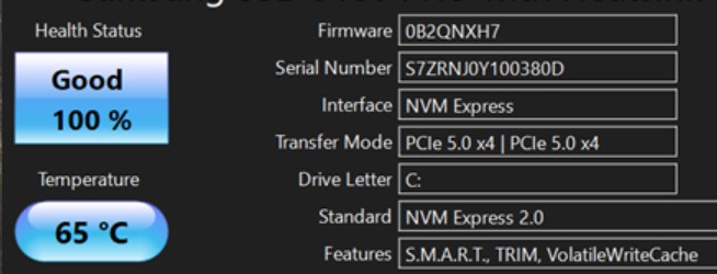 CDI reports firmware OB2QNXH7, PCIe 5.0 X4 and NVM Express 2.0. Temperature ranged from 30° (idle) to 80° (100% load). We could not detect any throttling.