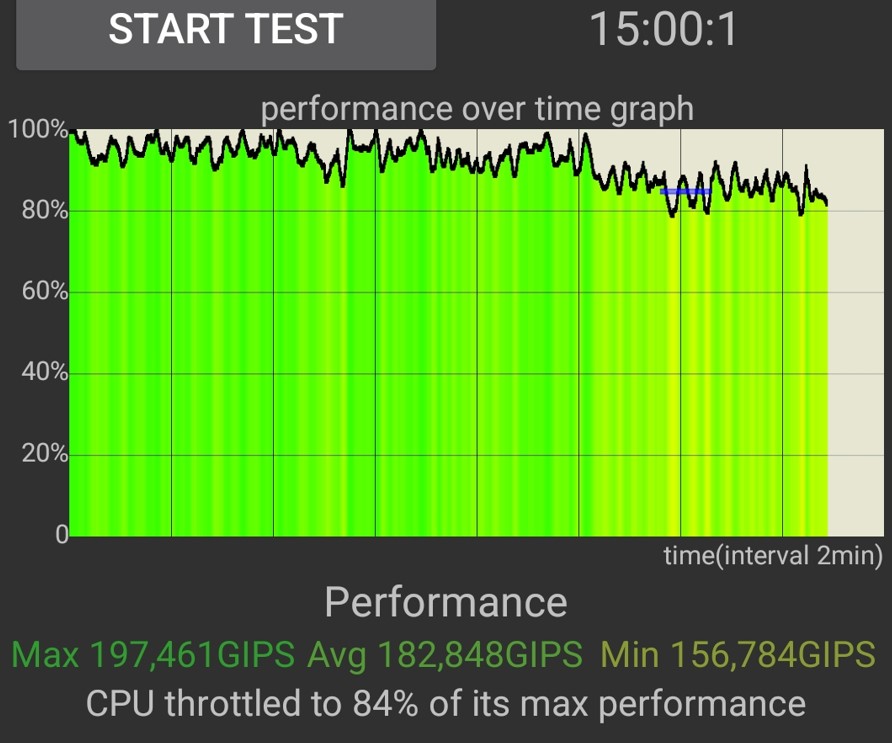 It drops 16% over 15 minutes – reasonable thermal management.