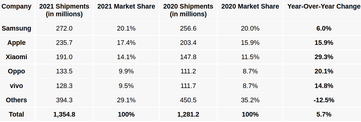 Samsung’s A-series accounted for the largest slice of its sales. These were well-priced and well-featured phones and probably made more sales as it is a South Korean brand and manufacture in Vietnam. The Galaxy S21 series lacked market penetration, but the Fold and Flip 3 made up for that.