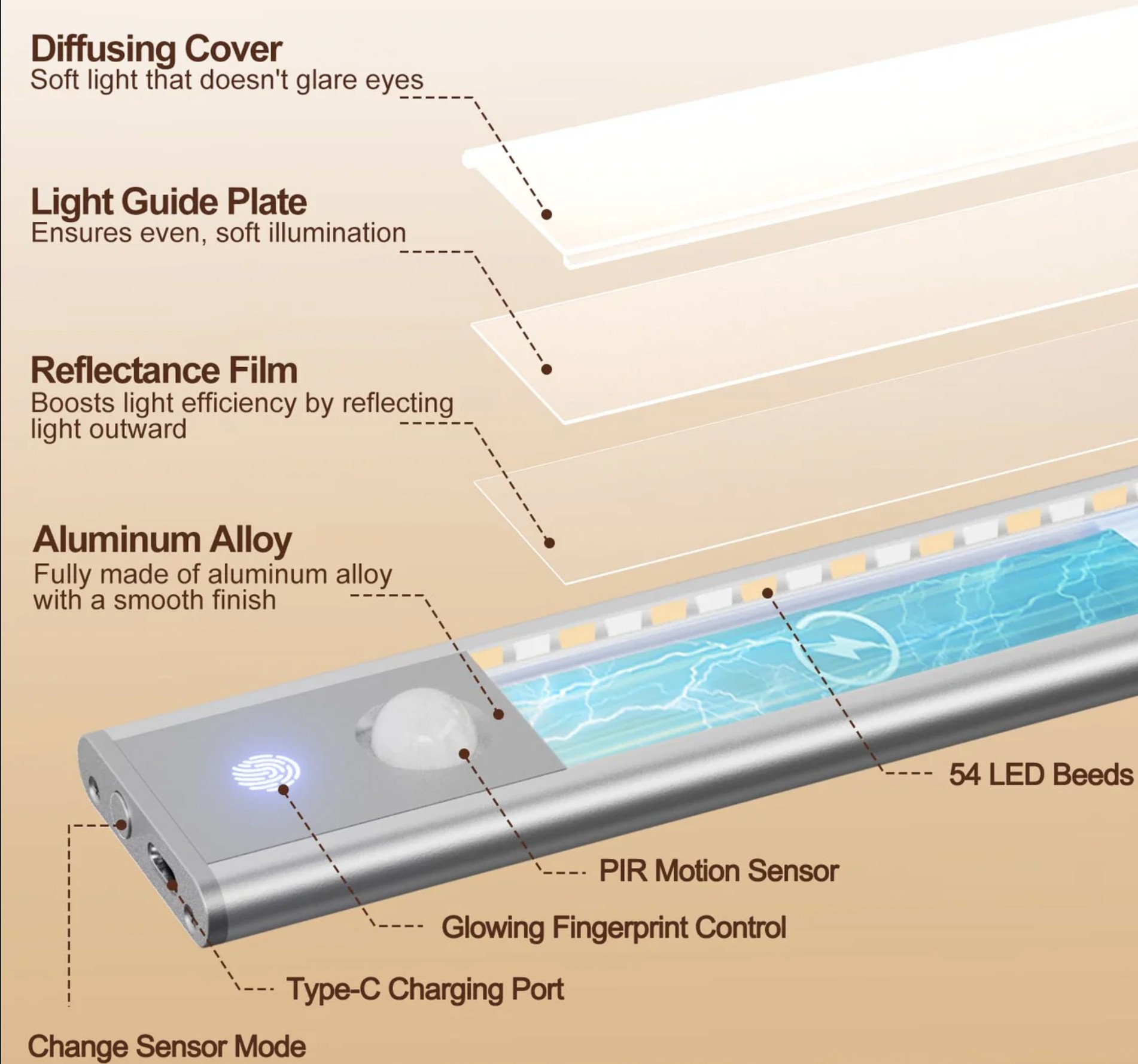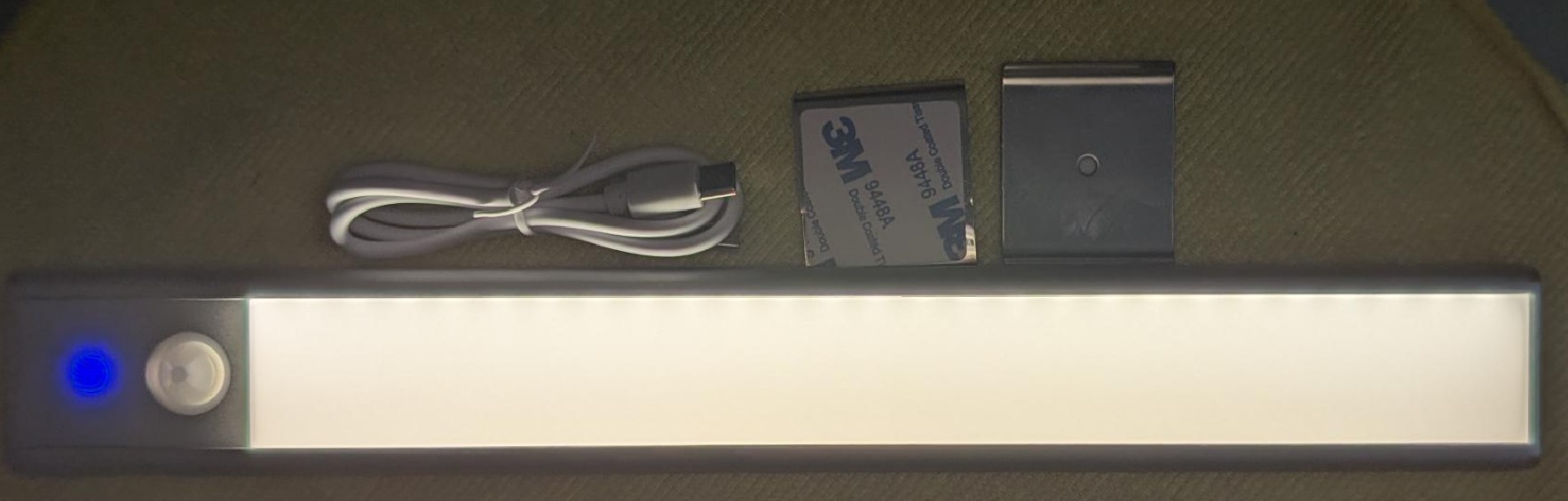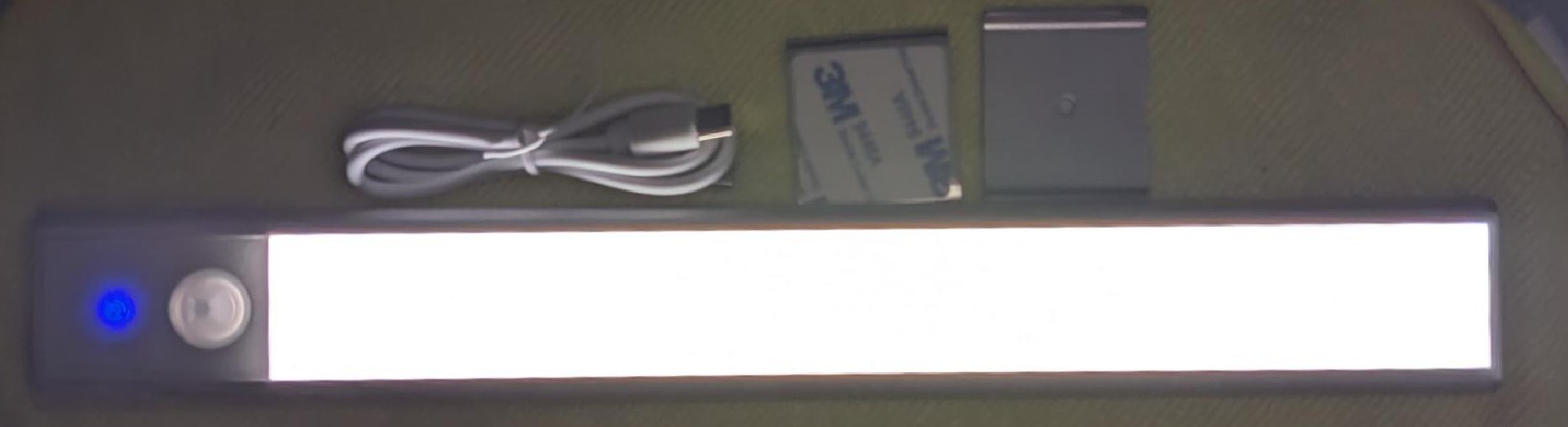 It is a USB-C rechargeable LED light bar with settings for Night (it only works when it’s dark and motion) and all day (it works when there is motion). You can also select 10-100% light output and three LED temperatures: 3000 (warm white, avoiding Blue Light), 4000 (neutral white), and 6000° Kelvin (cool white).
