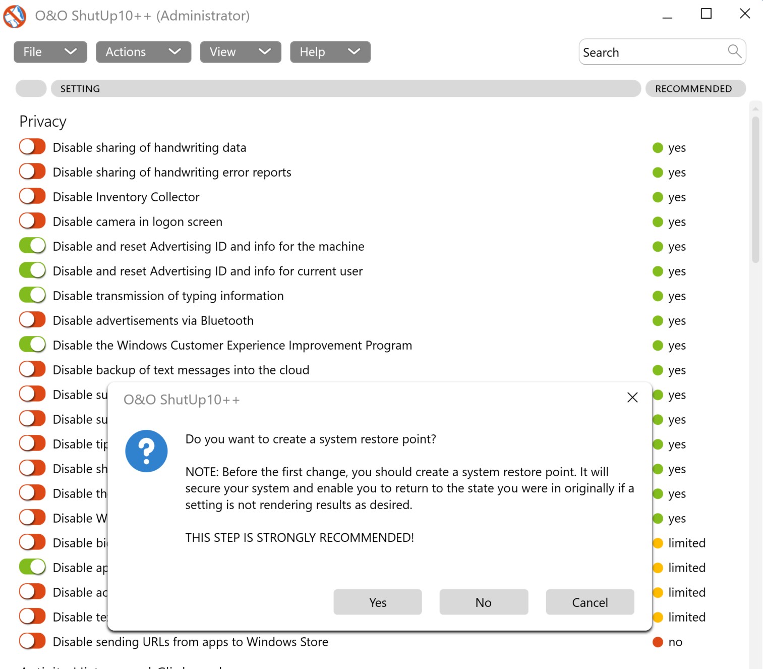 The great thing is that before you run it, a backup of the system settings allows you to safely undo any issues that you may find later. For example, it can close camera and microphone access to all apps, yet some need them. You should rerun this after every major update as Windows tries to reset privacy to its defaults.