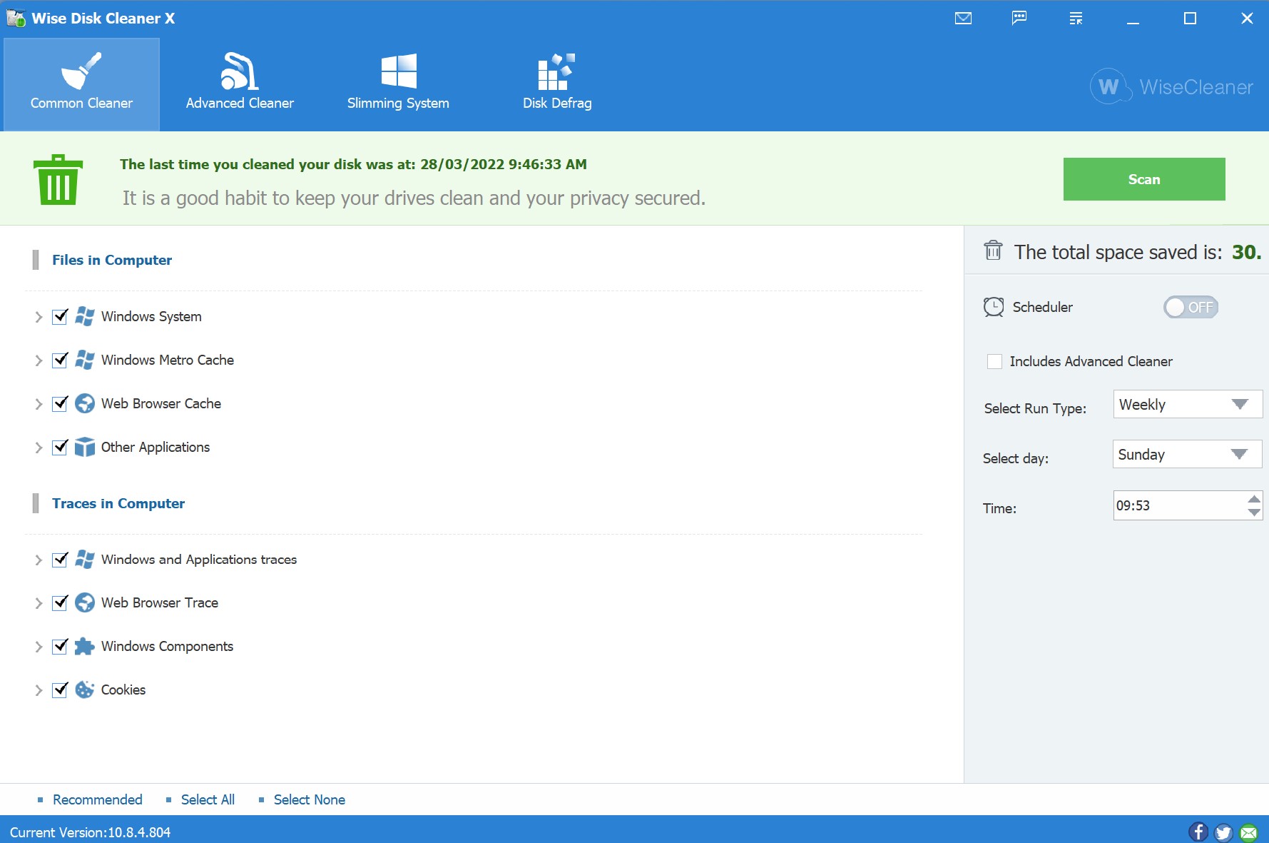 Disk Cleaner removes junk and temporary files, clears the internet browser cache (all types) of cookies and web traces, and frees up space. You can schedule it to run regularly.