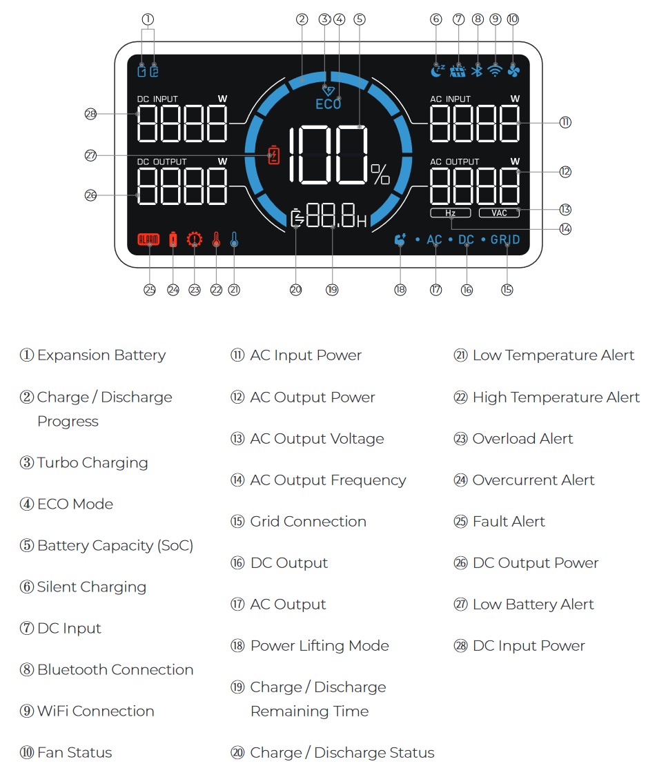 Most have an LCD readout, like the Bluetti featured below. As long as the unit shows the remaining Wh, port loads, and charge status, you will cover most things.