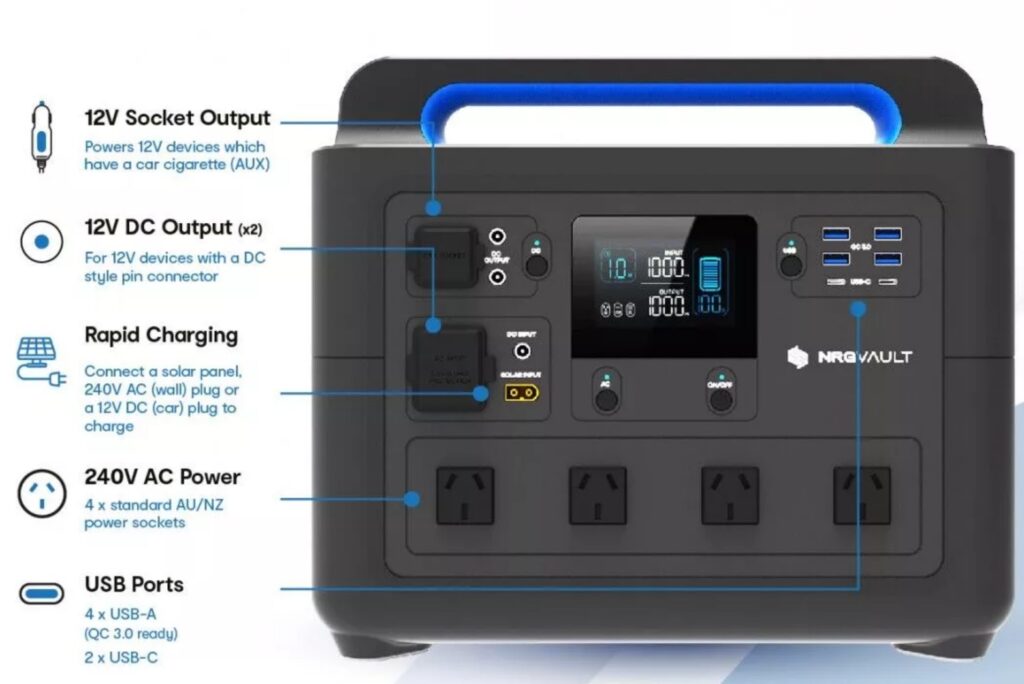 For example, the NRGVault pictured below has four x 1500W ports but only a 1500W inverter; the maximum load across all four ports is 1500W. Don’t think you can plug in a power board for more outlets!