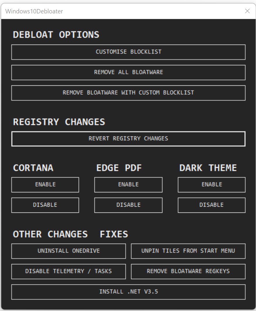 We tested the removal of Cortana (works), leave Edge PDF for now, and disable Dark Theme (unless you want it).